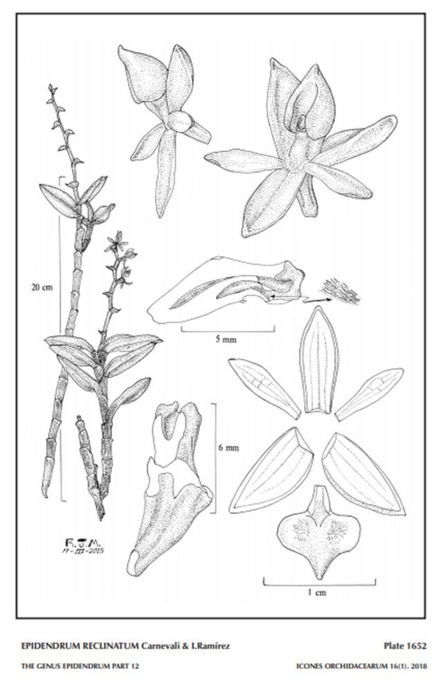 "Epidendrum reclinatum belongs to the GROUP Aquaticum which is characterized by the monopodial, branching habit, the distichous, erect to arching-nutant inflorescence, with fleshy flowers, and the disc of the lip and/or nectary often pilose. The species is recognized by the short, prostrate plants with scarcely branching stems, lanceolate leaves 1.4 to 2" x .32 to .44" [3.5 to 5.0 x 0.8 to 1.1 cm], light yellowish green in color, inflorescences short, erect to somewhat arching, about twice as long as the apical leaf, racemose, with 6 to 8 white to yellowish white flowers, petals spatulate with the margin erose, .28 to .32" x .084 to .104" [6.5 to 8.0 x 2.1 to 2.6 mm], the lip widely rhombic with a prominent, fleshy apical mucro at the apex. Epidendrum montigena Ridl. has oblong leaves .8 to 1.4 x .16 to .24" [2.0 to 3.5 0.4 to 0.6 cm], the inflorescence is racemose to paniculate, and nutant with 10 to 28 pink flowers, the petals oblong-elliptic, the apical margin dentate, lip somewhat 3-lobed, with the mid-lobe triangular. Epidendrum alsum Ridl. has ovate leaves 1 to 1.72" x .56 to .72" [2.5 to 4.3 x 1.4 to 1.8 cm], the inflorescence paniculate and nutant, flowers yellow, petals narrowly lanceolate, .28 to .36" x .076 to .084" [7 to 9 x 1.9 to 2.1 mm]." Hagsater 2018