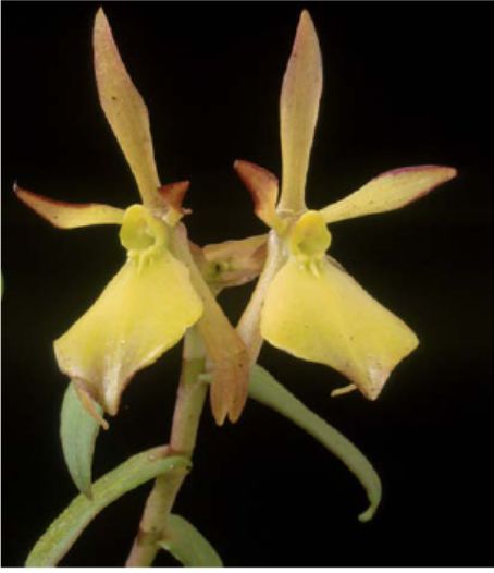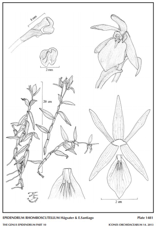 "Epidendrum rhomboscutellum belongs to GROUP Megalospathum characterized by the caespitose but branching habit, many-leaved stem, fleshy, oblique leaves, a short, few flowered, raceme subtended by large semi-ovate spathaceous bracts, resupinate flowers, the column more or less united to the lip. The species is recognized by the scandent plant habit, relatively narrow, reclinate leaves .8 to 2.4" x .24 to .48" [2 to 6 x 0.6 to 1.2 cm], the inflorescence with 2, greenish yellow flowers, the apex of the petals tinged reddish brown, the petals narrowly oblanceolate-elliptic, acute, the lip ovate-rhombic, its base cuneate, and apex acute, bicallose, with a short mid-rib. Epidendrum scutella Lindl. has a caespitose habit, ovate-lanceolate leaves 1.68 to 4.8" x ,48 to 1" [4.7 to 12 x 1.2 to 2.5 cm], 5 flowered inflorescence, flowers lime green or yellowish green, petals ovate-lanceolate, apex acute, lip widely orbicular to orbicular-elliptic, the base cordate, and has a pair small calli ending in 2 to 3 very short, low ribs, with a longer mid-rib. Epidendrum miradoranum Dodson & D.E.Bennett has up to 4, purple-green flowers, bicolor column, pale purple at the base and intense greenish yellow towards the apex, the lip widely cordiform, obtuse. Epidendrum braccigerum Rchb.f. has triangular leaves, the apex acuminate and curved upwards, flowers pale rose, petals linear, the lip flabellate, emarginate. Epidendrum rhodochilum (Schltr.) Hágsater & Dodson has green flowers, the lip red, smaller sepals .68" [17 mm] long, the lip obovate, obtuse, the margin denticulate. Epidendrum falsum Rchb.f. has an oblong-ovate lip, apical margin denticulate, rachis elongate, with 6, laxly distributed flowers, the lip is partly free from the column. Epidendrum vulcanicum Schltr. has green flowers, narrowly lanceolate, 5-veined petals, lip obovate, the apex retuse, column is 5 mm long. Epidendrum lagotis Rchb.f. has narrowly elliptic leaves which are shorter and wider 1 to 1.4 x .4 to .6" [2. to 3.5 x 1.0 to 1.5 cm), oblanceolate petals with the apex rounded, and the lip is orbicular and apically rounded." Hagsater etal 2013