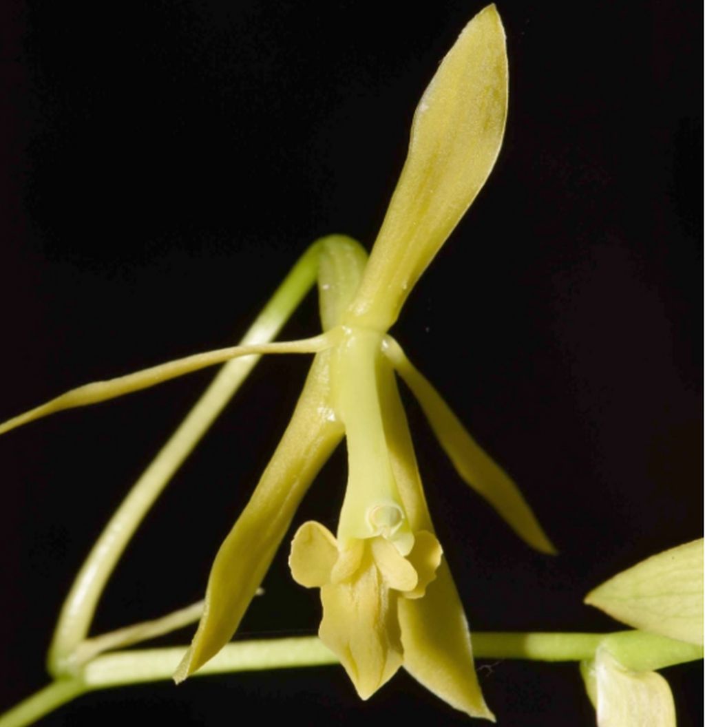 Found in Cunidinamarca department of Colombia from the Cordillera Oriental in northern Colombia, from the Páramo de Chingaza, at elevations around 2100 meters as a small to just medium sized, cold growing epiphyte with simple, cane-like, terete at the base, somewhat laterally compressed along the apical half, sub-erect stems covered at the base by tubular, non-foliar, scarious sheaths and carrying 3, sub-erect, alternate, articulate, coriaceous; basal sheath tubular, minutely striated, ancipitose, green, concolor; blade unequal in size (the basal leaf smaller), narrowly elliptic, apex acute, minutely apiculate, margin entire, spreading leaves that blooms in the spring on a terminal, arising through a narrowly elliptic, conduplicate in natural position, tubular at base, acute, amplexicaul, ochre-green, concolor, not sessile, but at the apex of peduncle spathe, peduncle.4 to 1" x .24" [1.0-2.5 x 0.6 cm], laterally compressed at the base, ancipitose at the apex, rachis laterally compressed, pale green, slightly sinuous, 8.4" [21 cm] long, apical, racemose or rarely paniculate, arching-nutant, laxly successively few, 6 to 7 flowered inflorescence so that 1-2 apical buds present when the lower flowers are totally developed, with much shorter than the ovary, linear-triangular, acuminate, embracing floral bracts and carrying resupinate, greenish yellow, concolor flowers with fragrance not registered.