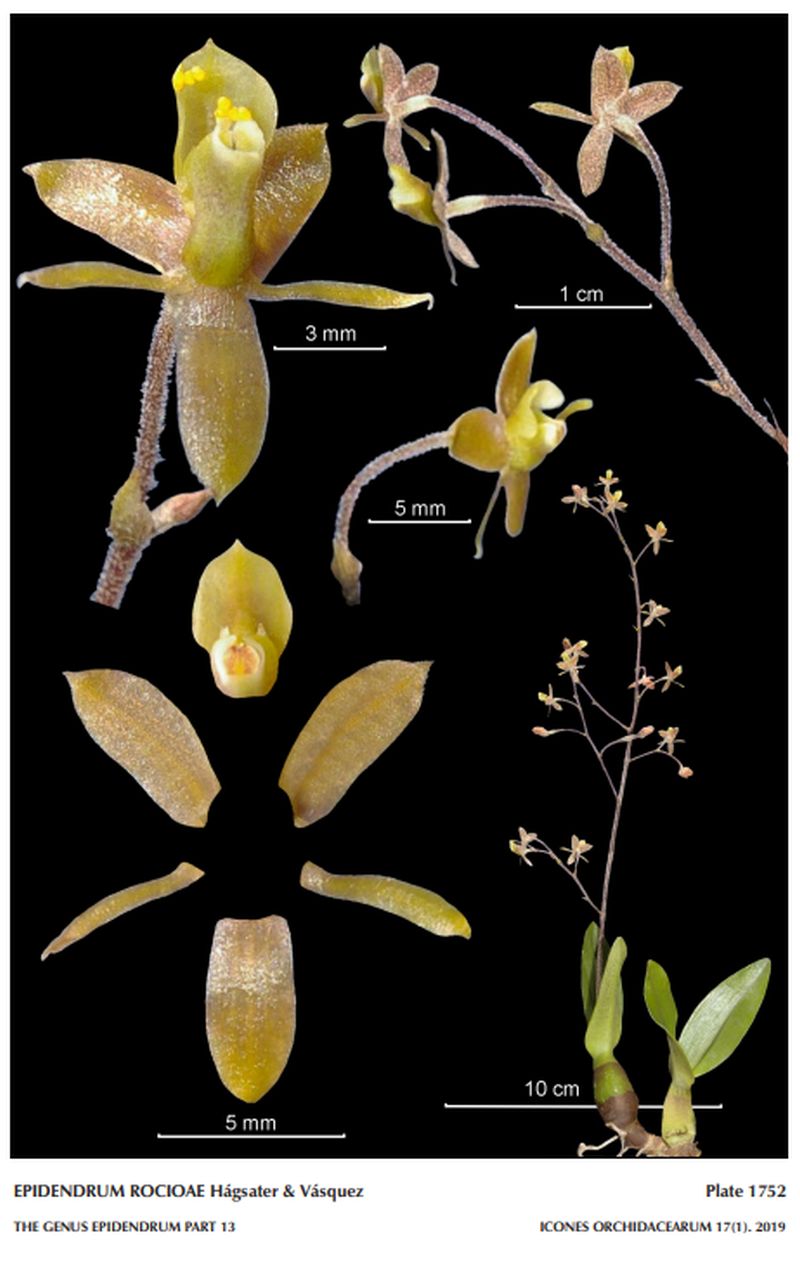 "Epidendrum rocioae belongs to the GROUP Lanium which is characterized by rhizomatous plants, the stems cane-like to pseudobulbous, leaves generally aggregate towards the apex, flowers non-resupinate, more or less pubescent, pollinia 2 or 4. The new species is recognized by the cylindrical pseudobulbs, 2 apical, sub-erect, elliptic leaves, inflorescence erect, paniculate; peduncle, rachis and ovaries short, densely pilose, rachis straight, sepals dorsally short pilose, petals narrowly oblong, margin entire, lip entire, base widely cuneate, hexagonal-rhombic, widest near the base, apex short apiculate, margin entire. Epidendrum avicula Lindl. has fusiform-ovoid stems, ovate leaves 1" [2.5 cm] long, the panicle about 2.8 to 4" [7 to 10 cm] long, lanceolate sepals, linear petals, a sub-rhombic lip of .18" [4.5 mm] long, with 2 keels in the disk. Epidendrum berkeleyi (Rolfe) Baptista has linear-oblong stems, 2-3 leaves, oblong, sub-acute, apiculate, an inflorescence about 5-10 cm long, lanceolate sepals, petals linear-filiform, and a lip for 4.8 mm long, ovate, concave, with the base of the disk bidentate. Epidendrum flexuoecallosum Hágsater & E.Santiago has up to 2.6" [6.5 cm] long stems with 3 to 6 elliptic-lanceolate leaves distributed throughout, spreading, linear petals with margins densely ciliate, and an ecallose, 3-lobed lip with two short cunicula at the base." Hagsater etal 2019
