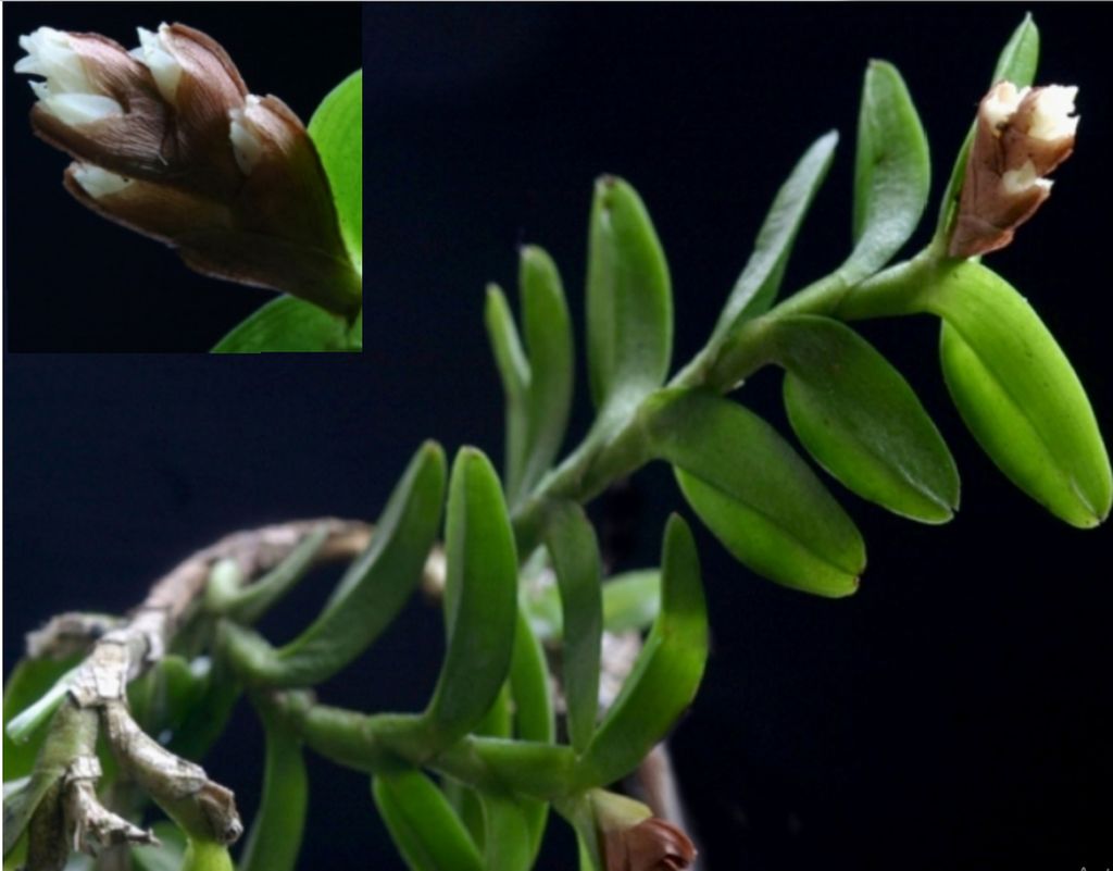 Found in Brazil on stunted shrubs and wind pruned trees on mountain tops and ridges at elevations of 5 to 1000 meters as a miniature to small sized, hot to warm growing, fleshy epiphyte with branching, short, the new stems produced from the nodes of the previous stem and from the base of the inflorescence, thus appearing to be longer, terete at base, laterally compressed towards the apex, fractiflex, the branches generally shorter than the previous stem, but sometimes equal or even longer stems enveloped by leaf sheath bases and carrying 4 to 8 on the primary stem, 2 to 5 on the branches, spreading, distributed throughout the stem, articulate, carinate, deciduous, succulent, distichous, with tubular rugose basal sheaths, blade carinate, ovate-elliptic when spread, apex acute, mucronate, margin entire, surface rugose leaves that blooms in the summer and fall on a short, terminal, without a spathe, peduncle .4 to .6" [1.0 to 1.5 mm] long, covered by 1, rarely 2 bracts, similar to the floral bracts, .6 to .8" [1.5 to 2.0 cm] long, apical, simple, distichous, succesivley 3 to 4 flowered inflorescence with each flower protected by a stout, opaque, snail-shell like, yellowish floral bract and carrying whte flowers with no detectable fragrance.