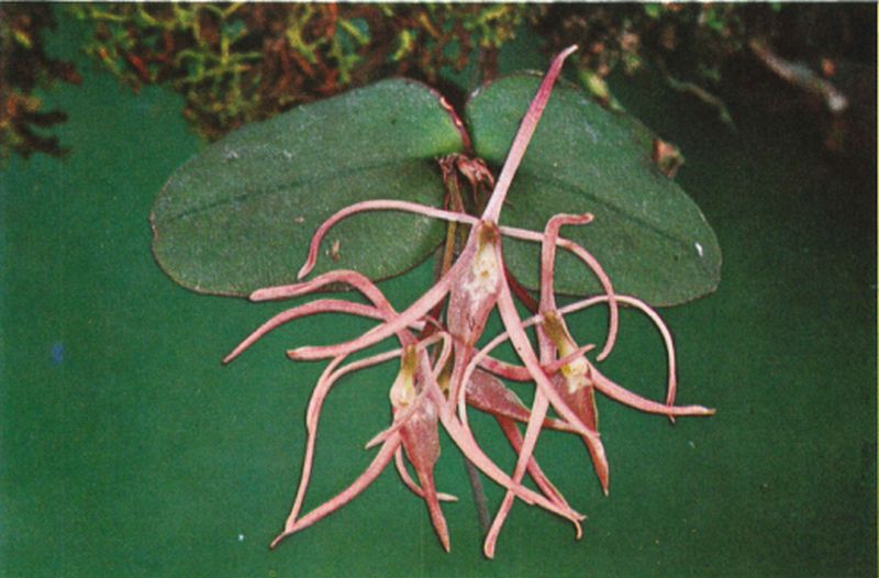 Epidendrum rowleyi is easily reconized by its thin stems carrying 2 to 3 apical, elliptic to orbicular leaves, short terminal inflorescence carrying flowers with extended, narrow segments of 1.2 to 2" [3 to 5 cm] long, and an ovate acuminate lip.