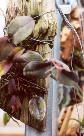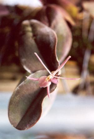 Found in Guerrero and Oaxaca states of Mexico on oaks in typical pine-oak forests on slopes above rivers at elevations of 2100 to 2500 meters as a miniature to small sized, cold growing epiphyte with simple, flattened canes carrying 2 to 3, thick and leathery, broadly elliptic to oblong, serrulate marginally, obtuse to acute, slightly cordate towards the base, basally clasping leaves that blooms in the winter and early spring on a terminal, short, single to few flowered inflorescence with lanceolate, obtuse floral bracts arising on a mature cane.