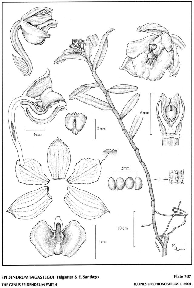 "Epidendrum sagasteguii belongs to the GROUP Andean SUBGROUP Renilabium which is characterized by the tall plants, monopodial habit, large, bilobed leaves, racemose inflorescence, entire to bilobed lip with a channel at the base of the lip between the calli. The new species is recognized by the flowers which open from the base of the inflorescence towards the apex, the sepals are somewhat shorter, and the petals have a deeply erose margin. Epidendrum renilabium produces the flowers from the apex of the inflorescence backwards, with concolor green flowers, the sepals are .56 to .72" [14 to 18 mm] long, the perals have an entire margin. Epidendrum pazii Hágsater has flowers opening from the base towards the apex, petals elliptic-obovate, obtuse, with entire margins. Epidendrum renilabloides Hágsater & Dodson has white to bronzy greenish flowers, opening from the apex towards the base of the inflorescence, the lip reniform, apiculate, with a "Y" shaped callus." Hagsater etal 2004