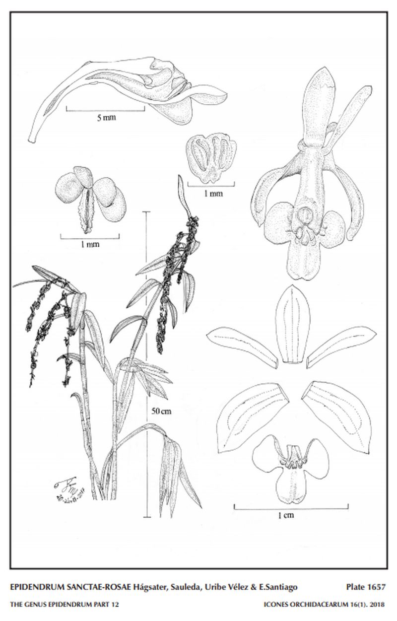 " Epidendrum sanctae-rosae belongs to the GROUP Amblostomioides recognized by the sympodial habit, with somewhat fusiform-thickened stems, sub-coriaceous, bilobed leaves, paniculate inflorescence, and ovary or flowers often pubescent, lip 3-lobed. The species is recognized by the nutant, many-flowered inflorescence, the flowers densely packed throughout the branches, on very short ovaries; the flowers small, sepals .24 x .12" [6 x 3 mm], disc of the lip provided with 3 very short, prominent ribs, reaching the base of the midlobe, united at the base, apically narrowly rounded, the mid-rib straight, the lateral ribs divergent, formed by a simple rib with a wider, sulcate rib on top; lateral lobes .08 X .12" [2 x 3 mm], transversely elliptic; mid-lobe .1 x .1" [2.5 x 2.5 mm], sub-quadrate, corners rounded, apex somewhat emarginate. Epidendrum purum Lindl. has oblong leaves 6.24 to 8.32" x .52" [15.6 to 20.8 x 1.3 cm], an erect inflorescence with larger flowers, sepals .48 to .52" [12 to 13 mm] long, narrowly lanceolate, acuminate, dorsal sepal spreading, petals linear, spreading, and the apex of dolabriform lateral lobes of the lip acute. Epidendrum subpurum Rchb.f. has a racemose inflorescence, laxly few-flowered, sepals .32" [8 mm] long, lateral lobes of the lip ovoid, acute." Hagsater etal 2018