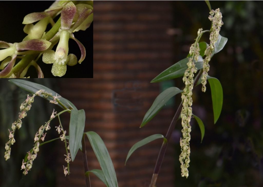 Found in Cauca department of Colombia from the upper basin of the Caquetá river, at elevations around 1600 meters as a medum to just large sized, cool growing epiphyte with cane-like, terete at base, laterally compressed towards the apex, slightly thickened in the middle (though without forming an evident fusiform pseudobulb), erect, straight stems, enveloped basally by non-foliar, tubular, scarious sheaths and carrying 8, distributed along the apical half of the stems, articulate, alternate, spreading and somewhat arched, green with the margin tinged with reddish purple, with tubular, minutely striated, tinged with reddish purple basal sheaths; blade oblong-lanceolate, acute, margin entire, spreading leaves that blooms in the fall on a terminal, without a spathe, peduncle ca. .8" [2.0 cm] long, laterally compressed, straight, without bracts; main raceme 11.2" [28 cm] long, with 2 branches 8 to 8.8" [20 to 22 cm] long, nutant, 12.4" [31 cm] long overall, apical, paniculate, flowering only once, nutantthe flowers densely packed throughout the branches, on very short ovaries, simultaneously 45 on the main raceme, 25-39 on the branches, 109 flowered inflorescence with shorter than the ovary, narrowly triangular, acuminate, embracing floral bracts and carrying resupinate, pale green flowers with the sepals, petals and apex of the column tinged rose-purple and the fragrance not registered.