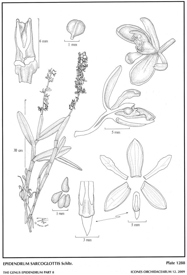 "Epidendrum sarcoglottis belongs to the GROUP Mancum which is characterized by the sympodial habit, few leaved stems, racemose inflorescence with 1 to 2 ancipitose, long, spathaceous bracts with parallel sides, and SUBGROUP Mancum which has non-resupinate, generally reduced and fleshy flowers. The species is recognized by its apically laterally compressed stems, 3 to 4, oblong-elliptic leaves, .32 to .36" [8 to 9 mm] long sepals, the petals with the margin undulate along the apical half, claw-shaped, entire lip, and the single, simple, flabellate callus. It is similar to Epidendrum adenoglossum Lindl. which grows in Peru, has linear-lanceolate leaves, short, .2" [5 mm long] sepals, petals with an entire margin, and a 3-callose lip, the lateral calli prominent, the mid callus shorter. Epidendrum mancum Lindl. is endemic to Ecuador, has shorter plants, 6 to 10" [15 to 25 cm] tall, short, wide leaves .8 to 2.4" x .52 to 1.08" [2 to 6 x 1.3 to 2.7 cm], small flowers, sepals .2 to .28" [5 to 7 mm] long, the lip reduced, 3-callose, the lateral calli prominent and elongate, the mid callus small and sub-globose. Epidendrum brachyglossum Lindl., also from Ecuador, has terete stems, narrow leaves .24 to .32" [.6 to .8 cm] wide, a 3-lobed, bicallose lip, the calli forming a fleshy, canaliculate cavity on the disc, the lateral lobes sub-orbicular, the midlobe transversely rectangular and entire." Hagsater etal 2009