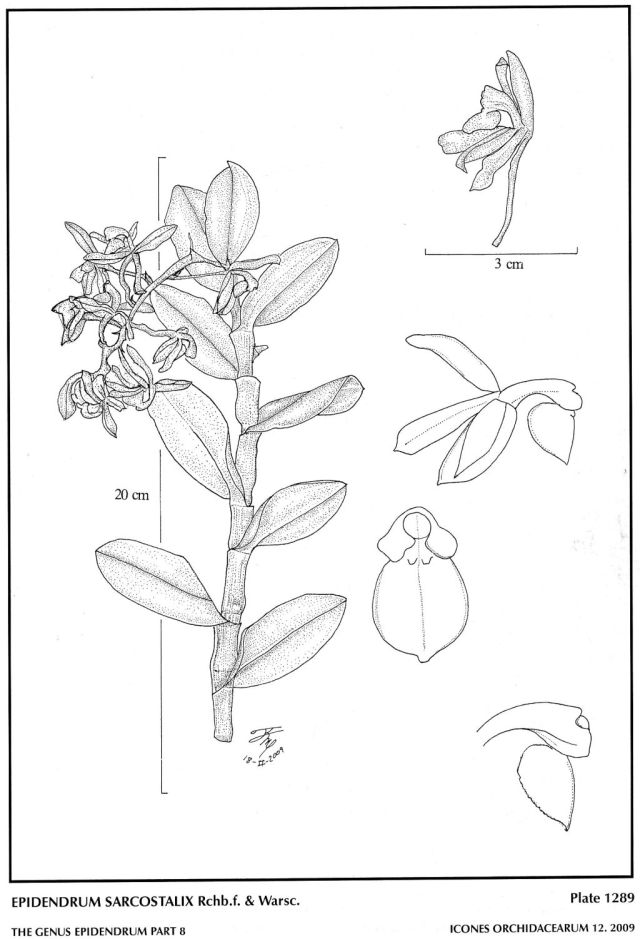 "Epidendrum sarcostalix belongs to the GROUP Andean SUBGROUP Cernuum, characterized by the monopodial habit, cane-like stems with subapical branches which are considerably shorter than the main stem, coriaceous to sub-coriaceous leaves, and fleshy flowers, the lip entire or 3-lobed. The species is recognized by the ovate-elliptic leaves 1.4" to 2.2" x .8 to 1! [3.5 to 5 x 2 to 2.5 cm], large flowers, sepals .6 to .68" [15 to 17 mm] long, convex, widely ovate-cordiform lip with minute calli. Epidendrum sumapacense Hágsater & E. Santiago is vegetatively very similar, but the lip is sub-reniform, with small lobes, very prominent calli and 3, low keels on the disc. Epidendrum orgyale Lindl. has oblong leaves 1.12" to 2" x .4 to .48" [2.8 to 5 x 1-1.2 cm], non-resupinate flowers with a elongate ovary, sepals .48 to .56" [12 to 14 mm] long, and the lip widely cordiform and the margin serrulate." Hagsater etal 2009