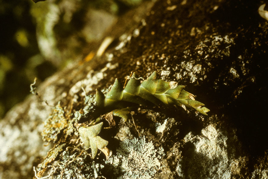 Found infrequently in Cuba and Jamaica at elevations around 500 meters as a mini-miniature sized, hot to warm growing, caespitose epiphyte with arcuate, anicpitose stems enveloped completely by 4 to 5, non-articulate, distichous, conduplicate, laterally compressed, triangular, falcate, acute, thick-coriaceous leaves that blooms in the late fall and winter on a terminal, sessile, distichous, slender, 3 to 5 flowered inflorescence with imbricating, covering the flowers, similar to the leaves floral bracts and carrying non-resupinate flowers.