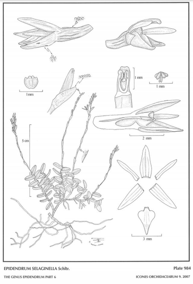 " Epidendrum selaginella Schltr. belongs to the GROUP Epidanthus which is characterized by short small, usually scandent plants with very thin stems, very narrow, more or less fleshy leaves, with a small, narrowly triangular, acute ligule opposite the blade, an apical, distichous, usually secund inflorescence, and 2 or 4 pollinia. The species is recognized by the 4 pollinia, stems which are laterally compressed above, ovate to oblong-ovate leaves, the flowers aggregate at the end of a long inflorescence, and the sepals dorsally papillose, as well as the ovary and the floral bracts, the triangular-cordate lip longer than wide united to the basal half of the column. Epidendrum stenoselaginella Hágsater & E.Santiago also with 4 pollinia, has terete stems covered with narrow, linear-lanceolate leaves, flowers laxly distributed on the inflorescence, ovate-triangular sepals, and the triangular-cordate lip nearly as wide as it is long, united to the column throughout its length, and the ovary and sepals glabrous. Epidendrum astroselaginella Hágsater & E.Santiago also has 4 pollinia, and is recognized by the spreading star-shaped, floral segmenls, the larger flowers with sepals .14 to .168" [3.5- 4.2 mm] long, very thin petals, and prominent teeth at the apex of the column, which are directed somewhat upwards, in front of the anther-bed. Most other species in this group have 2 pollinia." Hagsater etal 2007