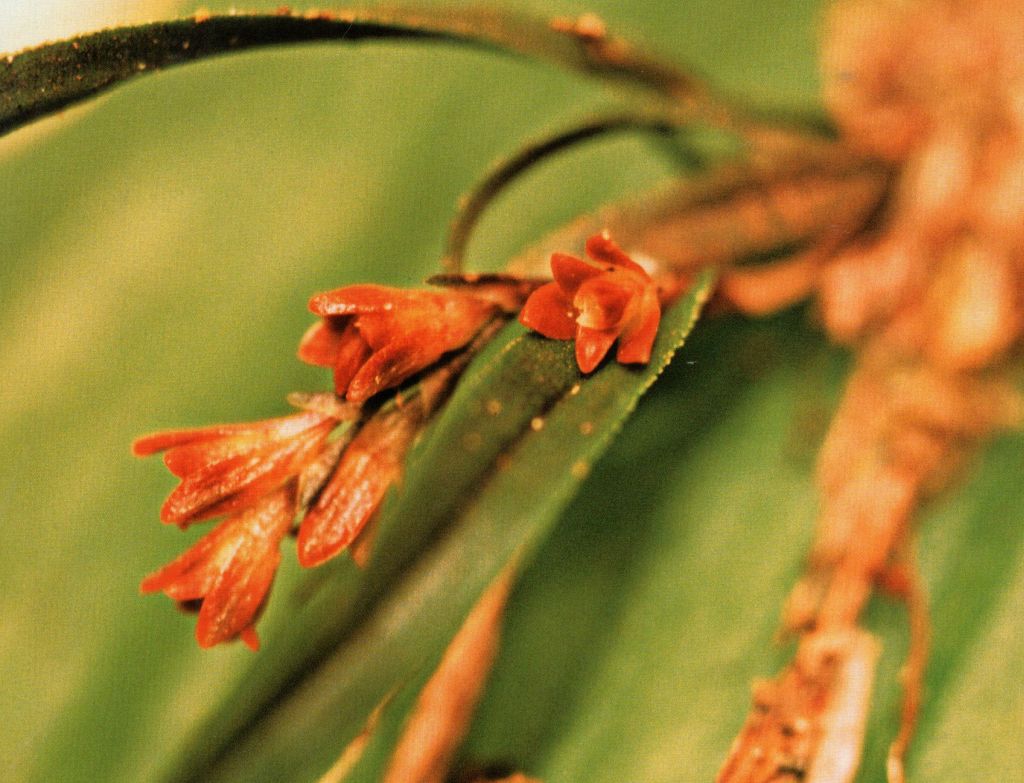 Found in eastern Cuba, Jamaica, Haiti and the Dominican Republic in wet broadleaved, pine forest and cloud forests at elevations of 1000 to 2300 meters as a mini-miniature to miniature sized, cool to cold growing, hanging, caespitose epiphyte with short, basally terete, somewhat compresssed above, sulcate, enveloped by 1 to 3 tubulbar, scarious-fibrous sheaths and a foliaceous blade, deciduous, only the apical, 1 to 2 persistent, sessile, conduplicate, narrowly linear-elliptic, acute to subobtuse, mucronate, coriaceous, dorsally keeled margin serrulate leaves that blooms at most any time of year on a terminal, without a spathe, racemose to paniculate, about as long as the leaves, peduncle terete, vary short, naked, 1.6" [4 cm] long, successively few, 5 to 12 flowered inflorescence with shorter than the ovary, ovate-triangular, short acuminate, amplexicaul, scarious floral bracts and carrying bell shaped, greenish yellow to red brown flowers.