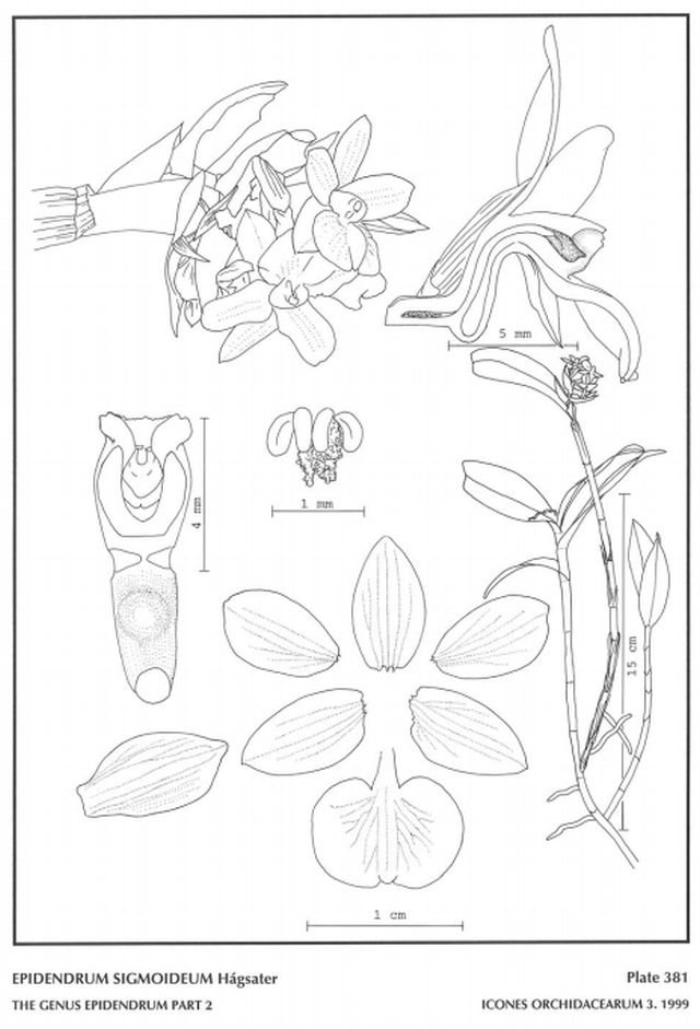 "Epidendrum sigmoideum is part of the GROUP Polychlamys SUBGROUP Polychlamys characterized by the successive lateral growths arising from the middle of the previous stem carrying a few leaves towards the apex and has a distichous, apical inflorescence with prominent, conduplicate, acute, glumaceous floral bracts. Easily distinguished from E barbae and others in the group by the obovate petals, the bilobed lip, with the lobes suborbicular, apically emarginate and with the rest entire, ecallose, with a raised central fleshy bump and a sigmoid ovary. Epidendrum barbae also has a spur, but the lip is apically 3-lobed, the ovary-column is straight, the flowers are yellow and the petals narrower. Epidendrum vulcanicola A. H. Heller has a straight ovary-column and a cordiform, acute lip. In E. bugabense Hágsater the ovary/column is straight, the lip obovate and apiculate. In E. cryptanthum L. O . Williams the flowers are nearly hidden by the bracts, all forming a compact cone and the lip envelops the column. The flowers of E. polychlamys are much larger and the lip is suborbicular-elliptic, without the nectary forming any prominent vesicle.