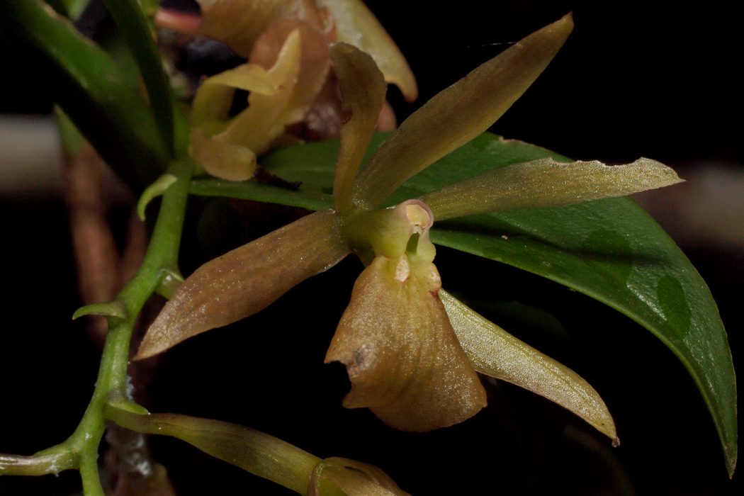 Found in northeastern French Guiana at low elevations as a miniature sized, hot growing epiphyte with fusiform, slightly compressed above pseudobulbs carrying 1 to 3, apical, sub-coriaceous, green slightly suffused with maroon, oblanceolate, obtuse leaves that blooms in the winter on a terminal, peduncle cylindrical, .64" [1.6 cm] long, provided with 2 to 3 sterile, triangular, cucullate bracts, 1 to 1.2" [2.5 to 3 cm] long, 1 to 6 flowered inflorescence with a floral bract shorter than the apical sterile bract and carrying glabrous, resupinate flowers.