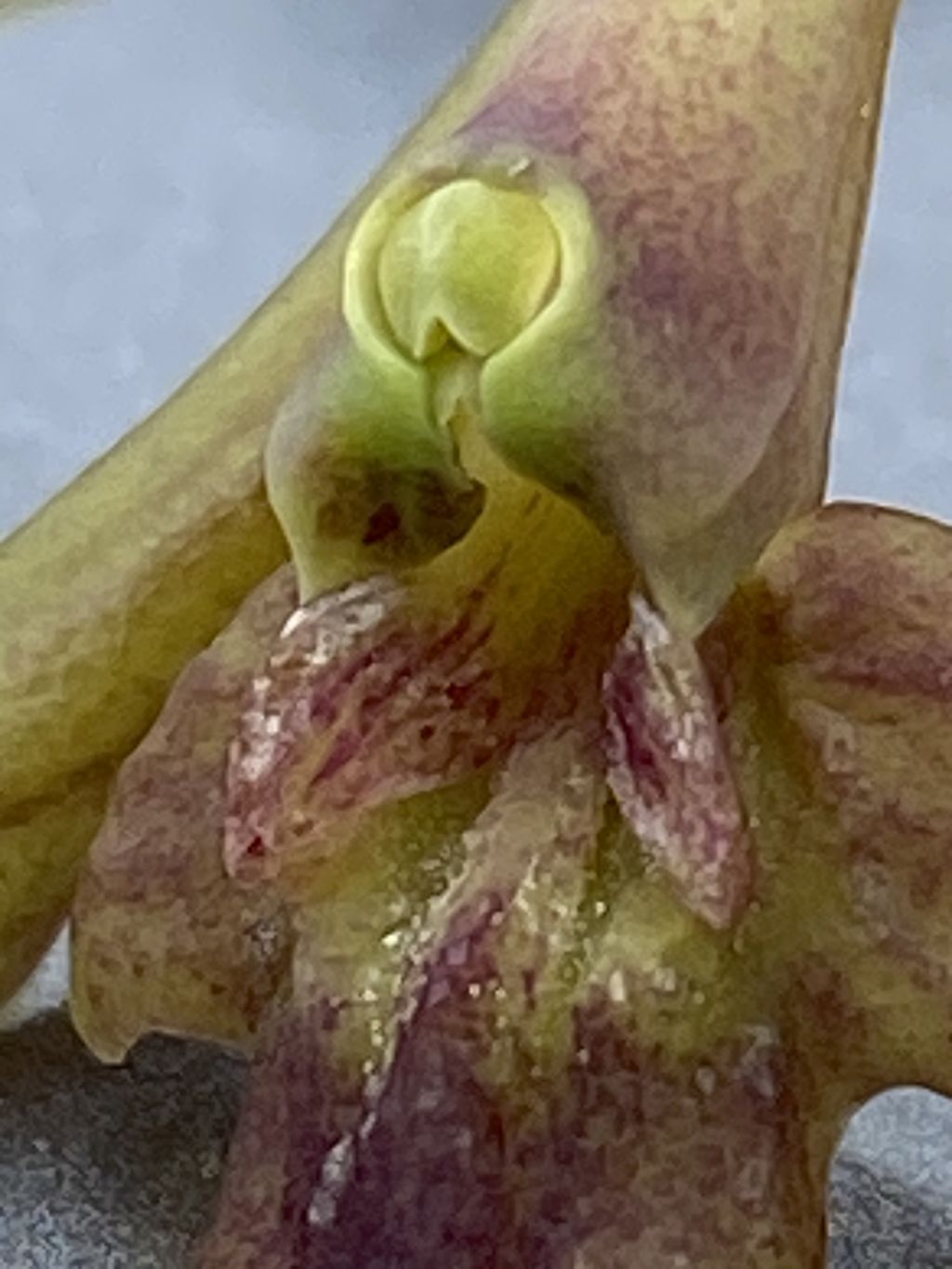 Found in Cundinamarca department of Colombia and Venezuela in cloud forests among bushes at elevations around 2400 to 3600 meters as a small to large sized, cold growing epiphyte, lithophyte and terrestrial with simple, cane-like, terete below, laterally compressed above stems carrying 3 to 5, aggregate towards the apex, oblong-elliptic, acute, apiculate, margin entire leaves that blooms in the late summer through early spring on a terminal, racemose or paniculate, suberect, peduncle completly enveloped by the laterally flattened spathe, occasionally with a spathe like bract at the middle, simultaenously several flowered inflorescence with progeressively diminishing in size, from as long as the ovary to shorter than the ovary, triangular, acuminate floral bracts and carrying resupinate, green to browish green flowers with a purple pink to reddish-brown hued column and lip.