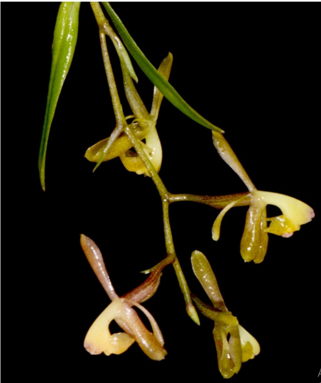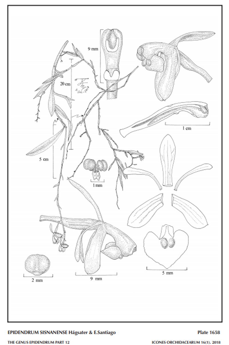 "Epidendrum sisnanense belongs to the GROUP Arbuscula SUBGROUP Incomptum which is characterized by the erect habit with successive lateral growths produced from the middle of the previous growth, few leaves aggregate towards the apex of the stems, roots generally only from the base of the primordial stem, and apical inflorescence with fleshy, yellow to green to violet-green to black flowers with short ovaries, the lip entire to 3-lobed. The new species is recognized by the pendent plants with short stems, produced from sub-apical internode of the previous stem, grass-like leaves .72 to 2.68 " x .16 to .32" [1.8 to 6.7 x 0.4 to 0.8 cm], pendent, narrowly lanceolate, acuminate, inflorescence 2.2 to 5" [5.5 to 12.5 cm] long, laxly few-flowered, with 5 to 10 yellowish brown flowers, the lip and column yellow, petals .44 x .4" [11 x 1 mm], deflexed, linear-oblanceolate, apex rounded, and lip widely cordiform, its margin denticulate, and ovary inflated along the apical 2/3, ventrally. It is reminiscent of a very delicate version of Epidendrum erosum which has sturdy erect plants, leaves 1.4 to 2.48" x .34 to .56" [3.5 to 6.2 x 0.85 to 1.4 cm], sub-coriaceous, elliptic-lanceolate, obtuse to acute, inflorescence 1.8" [4.5 cm] long, up to 12 flowered, but the flowers densely aggregate on the rachis, flowers greenish yellow to green, the lip and apex of the column marked with purple-black, and petals .46 x .1 to .12" [11.5 x 2.5 to 3.0 mm], spreading, cuneate-spatulate, the lip reniform. Epidendrum sarcostalix Rchb.f. also has erect, more vigorous plants, leaves sub-coriaceous, ovate-elliptic, 1.4 to 2.2" x .8 to 1" [3.5 to 5.5 x 2.0 to 2.5 cm], apex rounded, inflorescence 2.4" [6 cm] long, with 12 flowers, sepals .6 to .68" [15 to 17 mm] long, petals oblanceolate-spatulate, .56 x .14" [14 x 3.5 mm] and lip with margin entire." Hagsater etal 2018