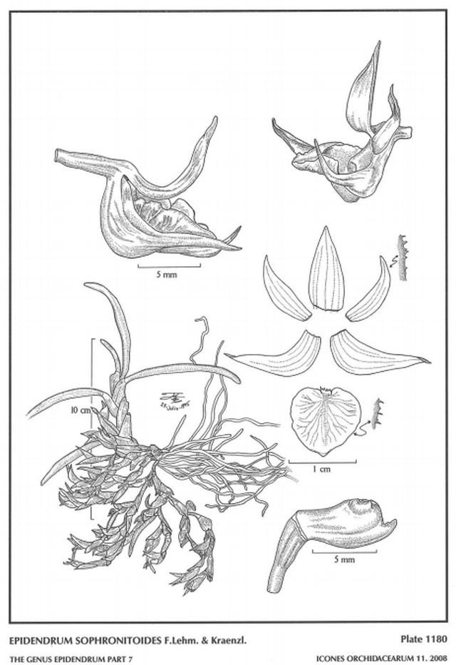 "Epidendrum sophronitoides belongs to the GROUP Takulumena which is recognized by the small, Vanda-like plants, with simple, imbricating, distichous leaves, and a lateral complicated inflorescence, producing new, single-flowered segments over several years. The species is recognized by the non-pubescent, greenish yellow to copper-green flowers, the margin of the petals and lip are ciliate, and the apex of the floral segments acuminate, sepals are .4 to .64" [10 to 16 mm] long. Epidendrum dasyanthum Hágsater (syn. Takufumena vazquezii Szlach., Mytnik, A. Rom. & Marg. has all the flora l segments strongly pubescent on the ventral surface, the flowers are salmon pink to reddish, sepals .36 to .53" [9 to 13 mm] long. Epidendrum rhodovandoides Hágsater has cardinal-red to reddish magenta colored flowers, sepals and petals are subacute, small, .16 to .2" [4 to 5 mm] long. Epidendrum psilosepalum Hagsater & E. Santiago has similar colored flowers, but the petals and the borders of the lip are strongly pubescent, sepals glabrous, .28 to .32" [7 to 8 mm] long." Hagsater etal 2008