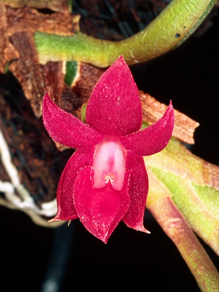 Found in Venezuela, Colombia and Ecuador in cloud and elfin forests as a mini-minature sized, cold to rarely cool growing epiphyte at elevations of [1400] 2000 to 3400 meters with branching, leafy stems completely enveloped by leaf-bearing sheaths and carrying thick, coriaceous, sulcate mid nerve, dorsally rounded, apically asymetric, often finely erose margins, basally clasping leaves that blooms in the spring on short growths, arising from among the roots at the base of the leafy stems, terminal, short, single flowered inflorescence enveloped almost completely by imbricating, tubular bracts and carries a non-fragrant, non-resupinate flower.