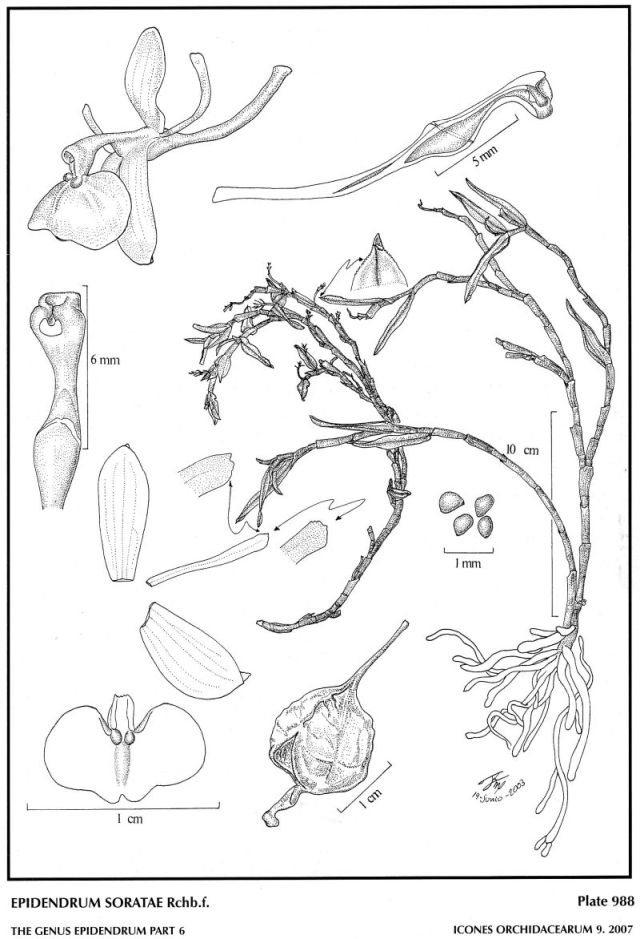 "Epídendrum soratae belongs to the GROUP Andean SUBGROUP Soratae which is characterized by the branching habit starting on a monopodial, primary stem, infundibuliform, rugose leaf-sheaths, lanceolate, aristate, acute leaves, racemose subcapitate inflorescence on a short, thin peduncle, and the bicallose lip. The species can be recognized by the reniform, apically somewhat 3-lobed, bicallose lip, and the .24 to .28" [6 to 7 mm] long sepals, Epídendrum oblíquum Schltr. has a reniform, emarginate lip .16 x .32" [4 x 8 mm] in size and a straight column. Epídendrum cardenasíí Hágsater has larger flowers, .48 to .52" [12 to 13 mm] long sepals, the lip bilobed, widely emarginate and about as long as it is wide, the base short cordate and the calli laminar and divaricate. Epídendrum tetragonoides Hágsater & Dodson has a rectangular lip, the apex truncate, sepals .28 to .32" [7 to 8 mm] long, the lip is oblong-rectangular, with two inconspicuous lobes at the base. Epidendrum cartilaginiflorum has a cordiform, somewhat 3-lobed-lip with the apex obtuse, rounded, and the sepals are .64 [16 mm] long. Epídendrum ardens Kraenzl. has bright orange flowers, with an entire lip. The name has been often been misapplied to a Antillean species, now named E. annabelae Nir which has an apiculate reniform to broadly cordiform lip and .2 to .24" [5 to 6 mm] long-sepals " Hagsater etal 2007