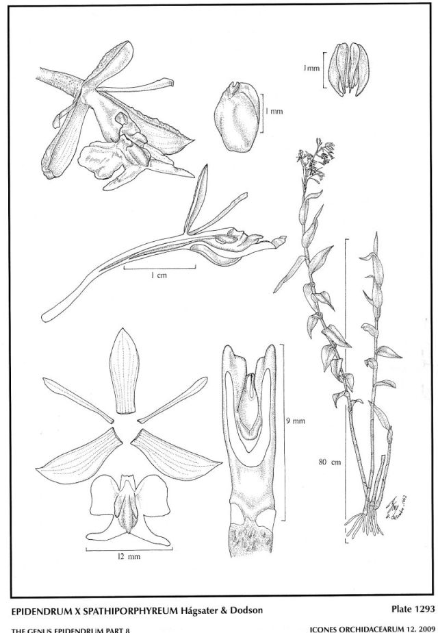 Found in Ecuador on the western slopes of the Andes without elevational data as a naturally occuring hybrid between E spathatum and E porphyreum and is a giant sized epiphyte with cane-like, simple, basal half terete, slightly laterally compressed above, straight stem and carrying 22 to 24, all along the apical 2/3's of the stem, sub-coriaceous, lanceolate to narrowly elliptic, acute, dosally carinate leaves that blooms in the late spring through earlier fall on a terminal, paniculate, sub-erect, peduncle laterally compressed, enveloped completely by 8, tubular, acuminate, scarious, papery, progressively smaller bracts, lax, panicualte, each branch subteneded by a triangular-lanceolate, amplexicaul, long-acuminate, papery green bract, each branch few flowered, successively few, to 50 flowered inflorescence with much shorter than the ovary, triangular, acuminate, progressively shorter floral bracts and carrying resupinate, somewhat fleshy, non-fragrant flowers with sepals that are dorsally reddish and somewhat yellowish ventrally, the petals reddish white, the lip ivory white becoming reddish orange with age and a white column that is slightly reddish pink.
