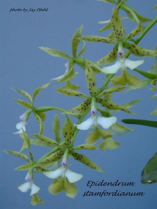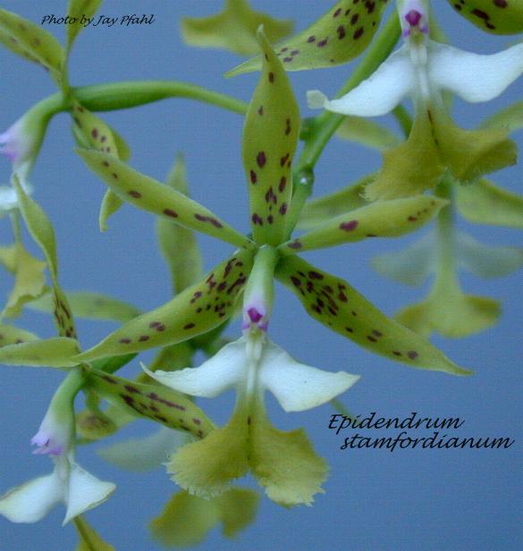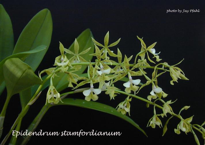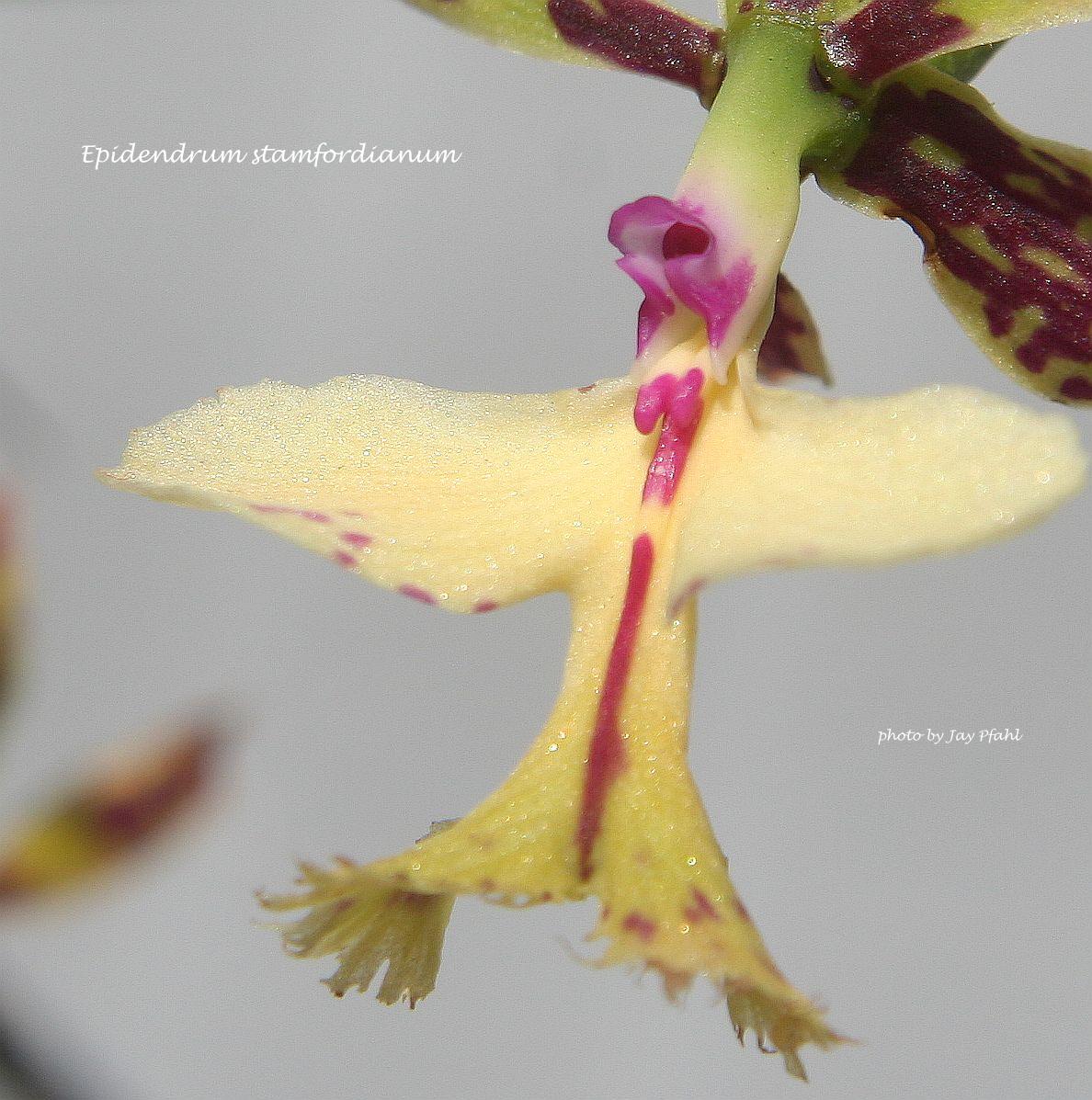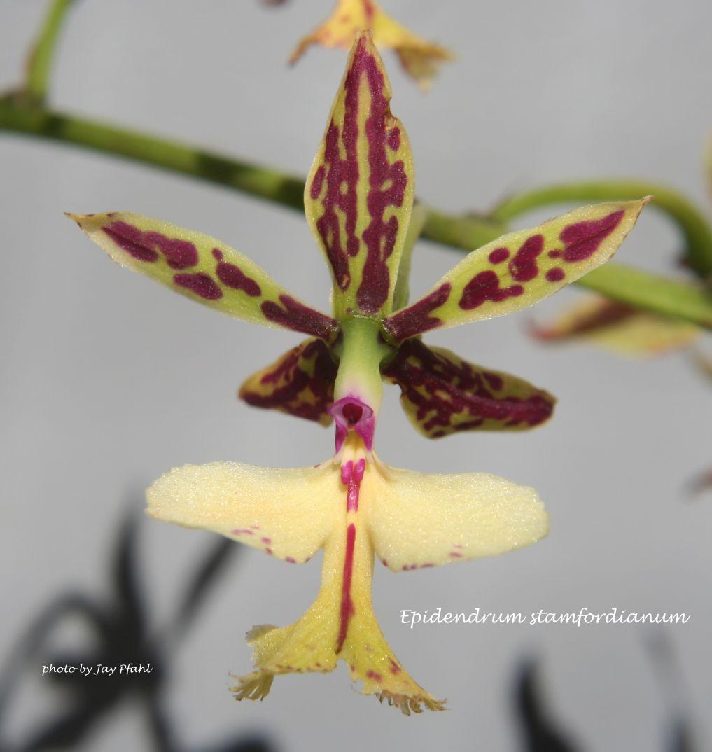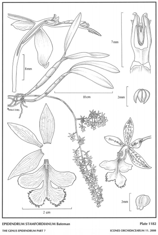 References W3 Tropicos, Kew Monocot list , IPNI ; *Orchid. Mexico & Guatemala, t. 11. Bateman 1838; Bonplandia Rchb.f 1854; Xenia Orchidaceae vol 2 Rchb.f 1862; Die Orchideen Schlechter 1915 photo fide; Repert. Spec. Nov. Regni Veg. Beih. 6: 72 Schlechter 1919; Atlas des Orchidees Cultivees Constantin 1920 drawing fide; Repert. Sp. Nov. Regni. Veg. Beih. 17: 40. Panama Schlechter 1922; Repert. Sp. Nov. Regni. Veg. Beih. 19: 128. Costa Rica Schlechter 1923; Repert. Sp. Nov. Regni. Veg. Beih. 19: 219. Costa Rica Schlechter 1923; The Genus Epidendrum Ames 1936; The Orchids of Panama L.O. Williams & P Allen 1946; Ceiba Vol 5 No 1 L O Williams 1956; AOS Bulletin Vol 27 No 6 1958; Orchid Digest Vol 23 #3 1959 photo fide; AOS Bulletin VOl 28 No 3 1959 photo fide; AOS Bulletin Vol 28 No 6 1959 photo ok; AOS Bulletin Vol 29 No 6 1960 photo ok; AOS Bulletin Vol 30 No 5 1961 photo good; AOS Bulletin Vol 30 No 9 1961; Venezuelan Orchids Illustrated Vol 2 Dunsterville & Garay 1961 drawing fide; AOS Bulletin Vol 31 No 3 1962; AOS Bulletin Vol 33 #6 1964 photo fide; Encyclopedia of Cultivated Orchids Hawkes 1965 photo fide; AOS Bulletin Vol 36 #5 1967 photo fide; AOS Bulletin Vol 36 #9 1967; Flora de Venezuela Foldats Volumen XV Part 3 1970 drawing fide; Las Orquedias De El Salvador Vol 1 Hamer 1974 drawing/photo fide; Die Orchideen 3 Auflage Bd 1 Sonderabdruck aus Schlechter Lieferung 9 513 - 576 Brieger, Maatsch and Senghas 1977 as Auliza stamfordiana photo fide; Orchids of Venezuela [An illustrated field guide] Vol. 1 Dunsterville and Garay 1979 drawing fide; Las Orquedias de El Salvador Vol 3 Hamer 1981 drawing fide; Icones Planetarum Tropicarum plate 738 Dodson 1982 drawing fide; An Introdution to the Orchids of Mexico Wiard 1987 photo fide; Orchids Travel By Air A Pictoral Safari Mulder, Mulder-Roelfsema and Schuiteman 1990 photo fide; A Guide to Orchids of the World Hodgson, Paine and Anderson 1991 photo fide; Native Colombian Orchids Vol 2 COS 1991 photo fide; The Manual Of Cultivated Orchid Species Bechtel, Cribb & Launert 1992 photo fide; Icones Planetarum Tropicarum plate 1434 Atwood 1992 drawing fide; The Illustrated Encyclopedia of Orchids Pridgeon 1992 photo fide; Field Guide to the Orchids of Costa Rica and Panama Dressler 1993; Manual Of Orchids Stewart 1995; Orchid Digest Vol 60 No 1 1996 photo fide; Venezuela, Paraiso de Orquideas Romero 1997 photo fide; Guatemala Y Sus Orquideas Behar & Tinschert 1998 photo fide; Orchids of Venezuela [An illustrated field guide] Vol. 1 Ramiro and Carnevali 2000 drawing fide; Rudolf Schlechter Die Orchideen Band 1C lieferung 42 - 43 pg 2626 - 2762 Brieger 2001; Harvard Pap. Bot. 5 #2: Carnevali etal. 2001; AOS Bulletin Vol 71 No 9 2002 photo fide; Orquideologia Vol. 22 No 2 2002 photos/drawing fide; Botanica's Orchids Laurel Glen 2002 photo fide; Flora of the Venezuelan Guayana Vol 7 Steyermark, Berry, Yatskievych and Holst 2003; Manual de las Plantas de Costa Rica Vol 3 Hammel, Grayum, Herrera and Zamora 2003; *The Cattleya and Their Relatives Vol 7 The Debateable Epidendrum Withner & Harding 2004 photo fide; Icones Orchidacearum 7 Plate 752 Hagsater and Sanchez 2004 see note; Algunas Orquideas de Oaxaca Suarez 2004 photo fide; AOS Bulletin Vol 74 No 5 2005 photo fide; Orchids of Mexico Hagsater, Soto, Salazar, Jimenez, Lopez and Dressler 2005 photo fide; Vanishing Beauty, Native Costa Rican Orchids Vol 1 Pupulin 2005 photo fide; Flora's Orchids Nash & La Croix 2005 photo fide; Orquideologia 24: 2 Ortiz & Hagsater 2005 photo fide; Orquideologia Vol 24 #2 2006 photo fide; Boletim CAOB No 64 2006 photo fide; Icones Orchidacearum 11 Plate 1137 Hagsater 2008 see recognition section; Icones Orchidacearum Vol 11 Plate 1182 Hagsater & Sanchez 2008 drawing fide; Orchids of Costa Rica Vol 1 Morales 2009 photo fide; Las Orquideas del Peru Izerskyy & Bezverhov 2011 as E stanfordianum photo fide; AOS Bulletin Vol 81 #1 2012 photo fide; Orchid Digest Vol 77 #2 2013 photo fide; Guia de Orquideas de Chiapas Carlos Rommel Beutelspacher Baigts 2013 photo fide; Orchids of the Department of Valle De Cauca Colombia Vol 2 Kolanowska, Hagsater etal. 2014 photo drawing/photo fide; Algunas Orquideas de Mexico Tomo 1 Suarez 2013 photo fide; Orchids of the Darien Gap Kolanowska 2014 drawing/photo fide; AOS Bulletin Vol 86 #3 2017 photo fide; AOS Bulletin Vol 86 #4 2017 photo fide; Orquideas, Tesoro de Colombia Vol 2 Ortiz & Uribe 2017 drawing/photo fide; Orchid Genera and Species in Guatemala Archila, Szlachchetko, Chiron, Lipinska, Mystkowska and Bertolini 2018 AOS Bulletin Vol 88 # 1 2019 photo fide;