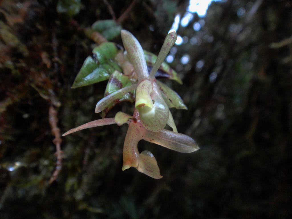 Found in Jardin, Antioquia department of Colombia at elevations around 2300 meters as a miniature sized, cold growing epiphyte with a lateral to pendent stem enveloped by sheaths carrying ovate, acute, olive green with red brown bars, basally clasping leaves that blooms in the spring on a terminal, short, 2 flowered inflorescence.
