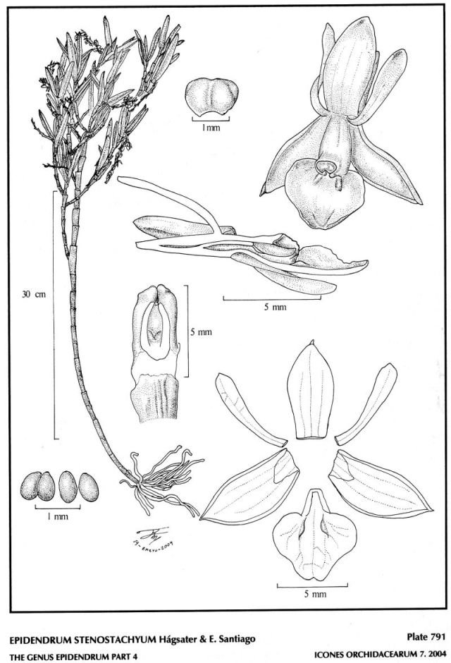 "Epidendrum stenostachyum belongs to the GROUP Andean SUBGROUP Soratae which is characterized by the branching habit starting on a monopodial primary stem, infundibuliform, rugose leaf-sheaths, lanceolate, aristate, acute leaves, racemose subcapitate inflorescence on a short, thin peduncle, and the bicallose lip. The new species is monopodial with many branches produced along the apical half of the stem, the inflorescence a long narrow cylinder with small flowers, the lip entire, widely triangular-ovate, the apex slightly retuse, and the falcate petals are somewhat more than twice as wide towards the apex as near the base. Epidendrum soratae from Bolivia, has a reniform, apically somewhat 3-lobed, bicallose lip, and the nectary inflated at the height of the perianth. Epidendrum karstenii Rchb.f., from around Bogotá, also has a narrowly cylindric inflorescence, but the plant habit is strictly sympodial and scarcely branched, with the new growth produced from the middle of the previous growth; the lip is deeply 3-lobed and the calli globose. Epidendrum scopulorum Rchb.f. is very similar but the new branches appear from the apex of the previous branch and thus appear as long branches with lateral inflorescences, wider ovate-lanceolate leaves .6" [1.5 cm] wide, relatively long peduncle of the inflorescence with an intermediate bract, few flowers on a compact, short, arching, nutant raceme, and the shallowly 3-lobed lip, the lobes subequal in size, the midlobe trapezoid and the base of the lip deeply cordate, the sepals about .32" [8 mm] long."Hagsater 2004