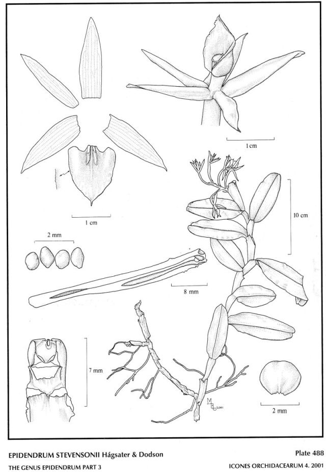 "Epidendrum stevensonii belongs to GROUP Geminiflorum and is closely related to E. geminiflorum Kunth; but E stevensonii can be recognized by the spade-like shape of the lip, the bottom half basically square and the apical half a right-angled triangle, the flowers are relatively numerous, 5 to 10 flowered. Epidendrum geminiflorum has a basically triangular lip, with small, semiorbicular lateral lobes at the base, the inflorescence being usually 2 to 3[4] flowered. Epidendrum philocremnum Hágsater & Dodson has .52" [13 mm] long sepals, linear-elliptic petals and the lip three-lobed, the lateral lobes suborbicular; it is found on the eastern side of the Andes, on cliffs and steep roadsides. Epidendrum rotundifolium Hágsater & Dodson has an excavated lip, and is found farther south, on both sides of the Ecuadorian-Peruvian border." Hagsater etal 2001