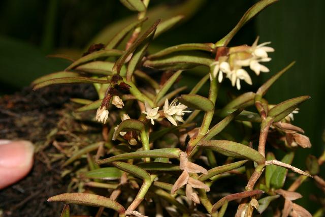 Found in Florida, Cuba, Dominican Republic, Haiti, Jamaica, Leewards, Trinidad & Tobago, Windwards, Mexico, Guatemala, Belize, Honduras, Nicaragua, Costa Rica, Panama, Colombia, Ecuador, Peru, Bolivia, Brazil, French Guiana, Surinam, Guyana and Venzuela in low disturbed forests and open fields at elevations of sealevel to 900 meters as a miniature sized, caespitose, pendant to horizontal, hot to warm growing, reedstem epiphyte with clustered, simple to branched stems enveloped by tubular, green-purple sheaths and carrying numerous, distichous, spreading, fleshy, elliptic to linear-lanceolate, acute, basally clasping leaves that blooms in the spring on a terminal, 1.4" [3.5 cm] long raceme with a few, small, successive opening flowers subtended by several large bracts that the flowers just barely clear.