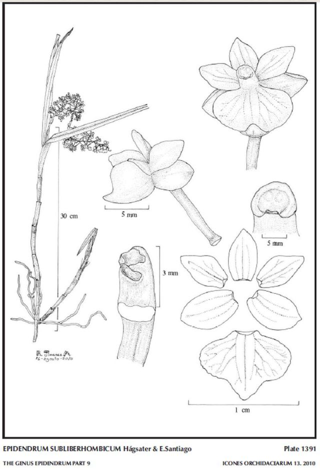 "Epidendrum subliberhombicum belongs to the GROUP Albomarginatum which is characterized by the monopodial, vertical, scandent, zigzag habit, stems cane-like below, somewhat thickened along the apical middle-half or third to form a fusiform pseudobulb, the new stem originating just below the thickened part of the previous stem, apically bifoliate; leaves linear-lanceolate to linear-oblong. The species is recognized by the large leaves 5.6 to 8.8"x .24 to .4" [14 to 22 x 0.6 to 1.0 cm], sepals .14 to .28" [3.5 to 5.2 mm] long, petals ovate-rhombic, the margin entire, .14 to .188" x .96 to 1" [3.5 to 4.7 x 2.4 to 2.5 mm], 3-veined, the lip with the base truncate and the mid-lobe widely triangular. It is very similar to Epidendrum subliberum C.Schweinf. which has smaller flowers with sepals .128 to .152" [3.2 to 3.8 mm] long, petals lanceolate, narrow, with the margin dentate, .128 to .14" x .44 to .52" [3.2 to 3.5 x 1.1 to 1.3 mm], 1-veined, and the lip with the base sub-cordate, and the mid-lobe rounded; the range of distribution overlaps. Epidendrum albomarginatum Rchb.f. has shorter, narrower leaves 1.2 to 3.6" x .06 to .16" [3 to 9 x 0.15 to 0.4 cm], a sometimes paniculate inflorescence, sepals .24 to .32" [6 to 8 mm] long, petals oblanceolate, rachis fractiflex and the lip united throughout the length of the column. Epidendrum francisci Chocce, Hágsater & Acuña has a paniculate inflorescence, the rachis slightly fractiflex, successive flowers, sepals .32" [8 mm] long, and the lip entire and united throughout the length of the column." Hagsater etal 2010