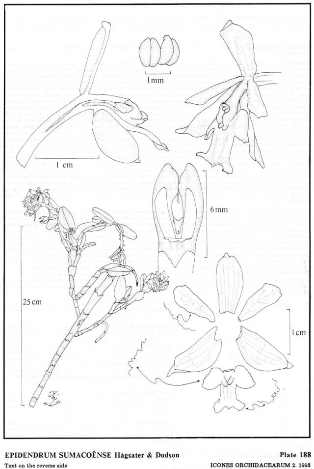 "The subapical branching and 3-lobed lip places E. sumacoense in the GROUP Andean SUBGROUP Sumacoense characterized by the monopodial branching habit, cane-like stems, branching sub-apically, the branches shorter than the main stem, leaves coriaceous to sub-coriaceous and fleshy flowers, the lip entire or 3-lobed. It is distinguished from other taxa by the single, branching vein of the cuneate, finely erose-denticulate petals, the lateral lobes of the lip smaller than the midlobe , obliquely ovate, with the external margin erose-denticulate, the midlobe with a long, straight isthmus and two divergent, small, apical, subquadrate lobes with the apical margin oblique and deeply erose-denticulate, and the sinus between them apiculate. Epidendrum sumacoense is closely related to E . pichinchae Schltr., which has the midlobe of the lip rhombic-ovate and acuminate" Hagsater etal 1993