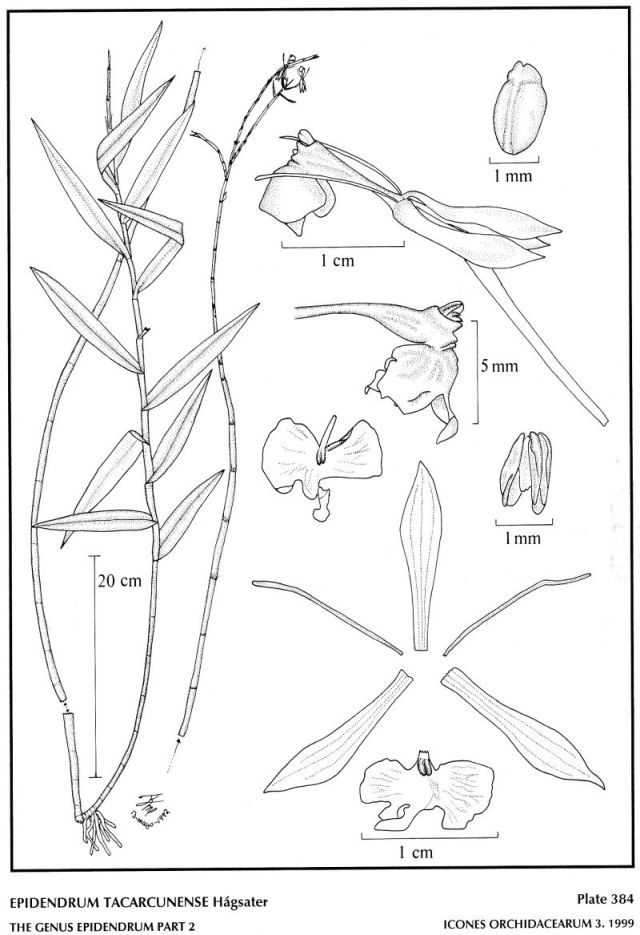 "Epidendrum tacarcunense is a member of the 1999 GROUP Pseudepidendrum SUBGROUP Turialvae and closely related to the former, from which it can be distinguished by the large plants, the terete stems, the very long floral bracts .36 to .64" [9-16 mm], the flowers are green, with the lip white with a disk purple. Epidendrum turialvae from Nicaragua, Costa Rica and western Panama has the same general coloring but the floral bracts are short, .08 to .16" [2 to 4 mm] long, and the proportions of the lip are more equal in length to width. Other species of this group, E. rodrigoi Hágsater and E. vieirae Hágsater also have laterally compressed stems." Hagsater etal 1999