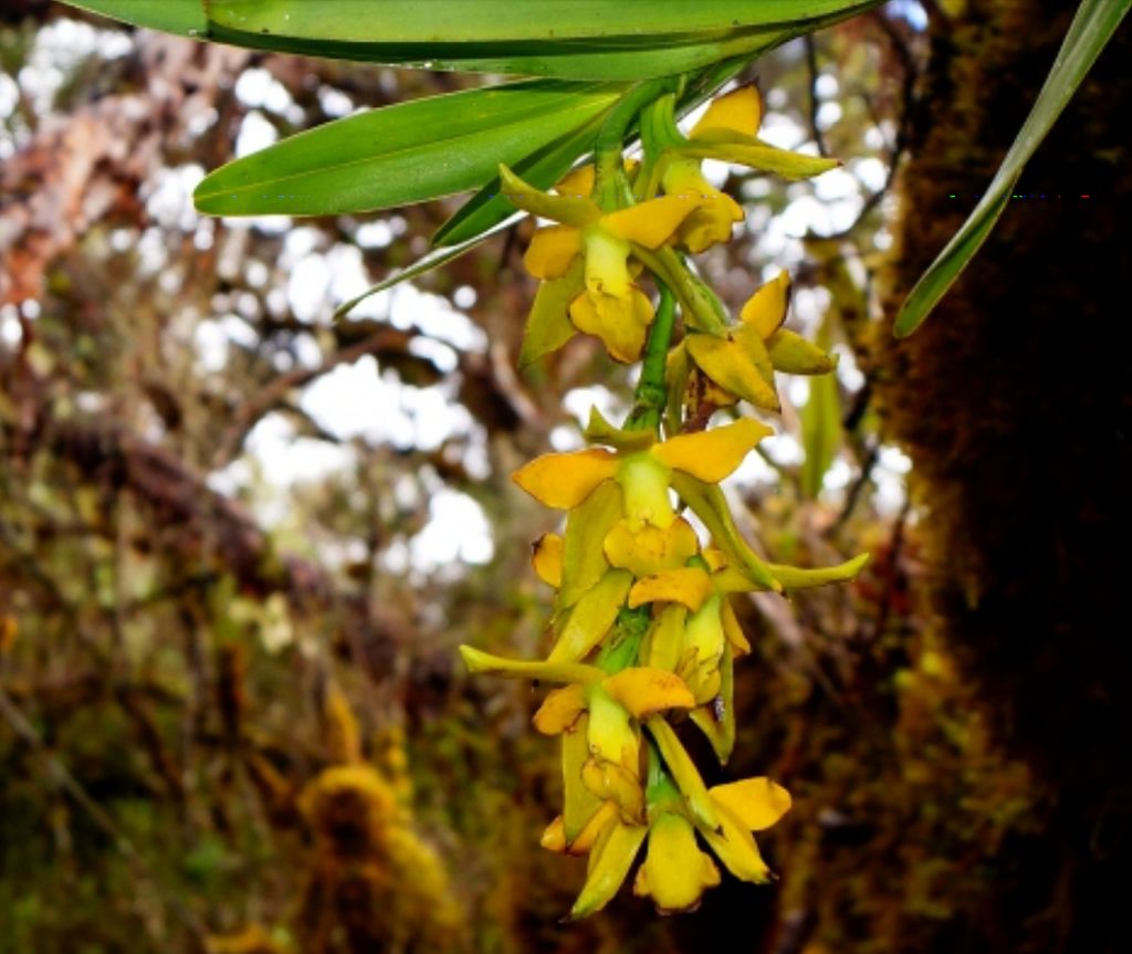 Found in Amazonas department of Peru, from the ridge along the eastern side of the Marañón river, near its northern end, near the Cerro de Campanario, epiphytic on Polylepis sp., in relict high Andean forests dominated by Queñas or Queñuales (Polylepis spp.) surrounded by extensive Pajonal, at elevations around 3450 meters as a giant sized, cold growing epiphyte with simple, cane-like, terete at base, somewhat laterally compressed towards the apex, erect to arching, straight stems with the base covered by nonfoliar, tubular, becoming scarious and fibrous with time sheaths and carrying 14 to 25, distributed throughout the stem; suberect, alternate, articulate, coriaceous, similar in size and shape; leaf sheath tubular, minutely striated greenish yellow with minute red warts; blade lanceolate, apex rounded, green, concolor, margin entire, slightly revolute leaveas that blooms in the summer on a terminal, without a spathe, peduncle .6" [1.5 cm] long, somewhat laterally compressed green, concolor, without bracts; rachis straight, totally hidden by the flowers, 3.6" [9 cm] long, apical, racemose, arching-nutant, distichous, sub-densely, simultaneously 7 flowered inflorescence with nearly as long as the ovary, triangular, acuminate, embracing floral bracts and carrying resupinate, very fleshy green flowers with the petals and lip yellow; fragrance not registered.