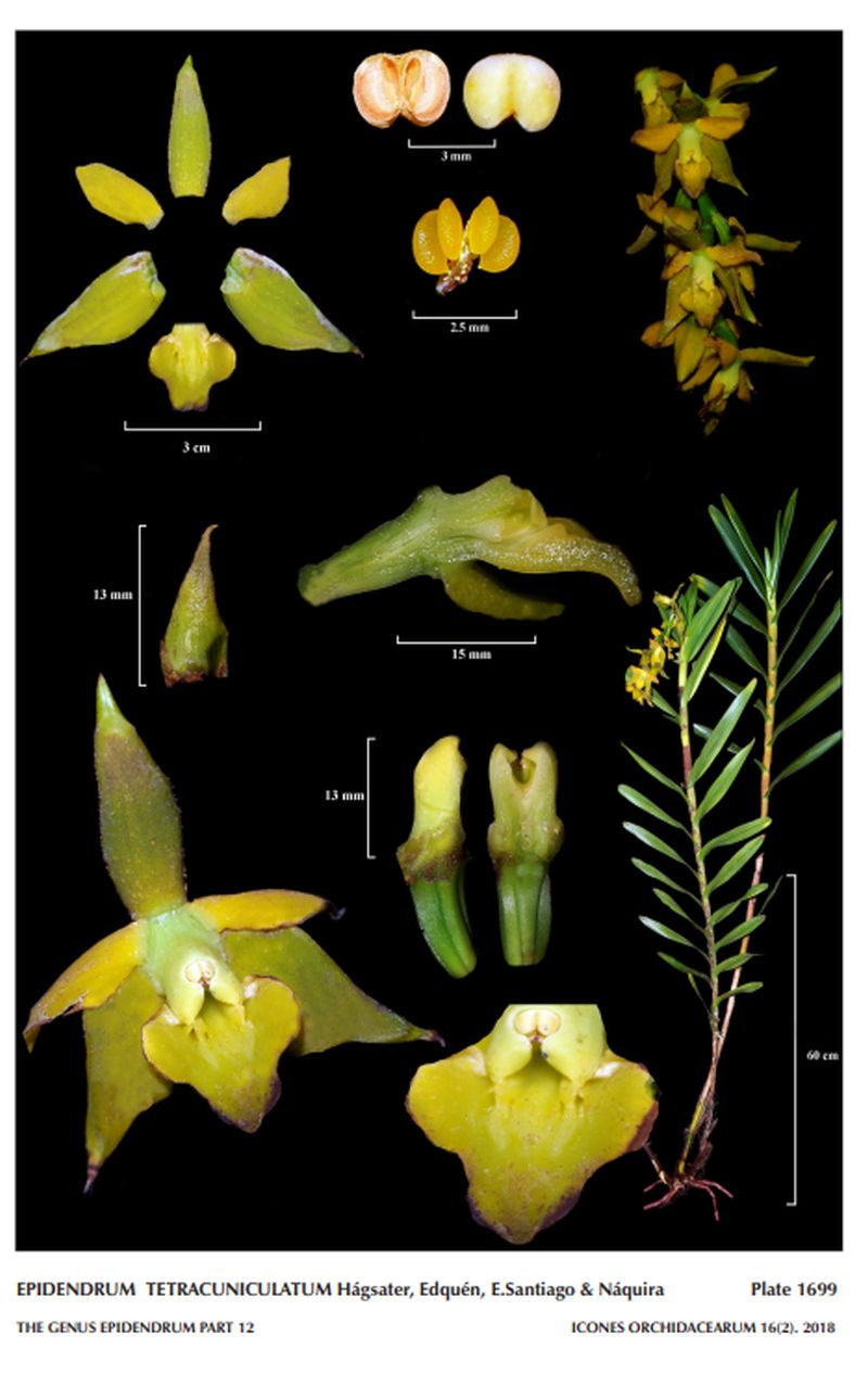 "Epidendrum tetracuniculatum appears to be somewhat close to the GROUP Aristisepalum which has a caespitose habit, simple stems, sub-coriaceous leaves, an arching-nutant, racemose inflorescence without spathes, a thickened disc on the 3-lobed lip, and especially lateral sepals which are apically prominently aristate-complanate, .6 to 1.48" [15 to 37 mm long]. The species is recognized by the overall larger plants and flowers, wide leaves, 3.6 to 8" x .8 to .96" [9 to 20 x 2.0 to 2.4 cm], sepals 1.12 to 1.48" [28 to 37 mm] long, flowers green with petals, column and 3-lobed lip yellow, lateral lobes hemi-elliptic, mid-lobe sub-quadrate when spread. Epidendrum incahuamanii Collantes & Hágsater has linearlanceolate leaves 1 to 6" x .12 to .36" [2.5 to 15 x 0.3 to 0.9 cm], the lip deeply 3-lobed, lateral lobes dolabriform-sub-elliptic, oblique, the disc thickened into a semi-circular plate, traversed by a prominent mid-rib extending to the apex of the mid-lobe which is 1 x .24" [2.5 x 6 mm], semi-circular, apex usually retuse. Epidendrum birostratum has wider leaves, 2.6 to 5.2" x .52 to .6" [6.5 to 13 x 1.3 to 1.5 cm], the lip with dolabriform-rounded lateral lobes, mid-lobe as long as the lateral lobes, cuneate, sub-quadrate, the apex sinuous-truncate, 3-dentate; disc with the thickened plate sub-quadrate-ovate. Epidendrum aristisepalum Hágsater & Dodson from southern Ecuador has similar leaves 2.4 to 5.8" x .28 to .44" [6 to 14.5 x 0.7 to 1.1 cm], but the ecallose lip has a sub-orbicular mid-lobe with the disc thickened into 3 prominent longitudinal ribs. Epidendrum jalcaënse Chocce, Dalström, Hágsater & J.Arnaiz has wider, shorter leaves, 1.88 to 2.64" x .4 to .6" [4.7 to 6.6 x 1.0 to 1.5 cm] , bright orange flowers with a wide, 4-lobed, ecallose lip, with 5 thickened ribs on the disc." Hagsater etal 2018