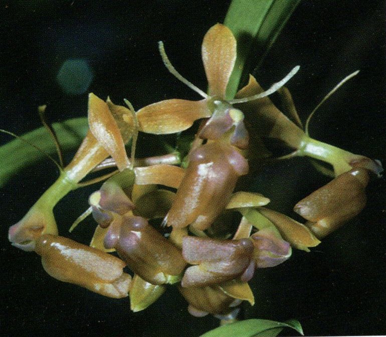 Found in Santa Cruz department of Bolivia at elevations around 1400 to 2000 meters as a small sized, cool growing epiphyte with erect, branching, filiform, flexuous stems carrying 3 to 4, towards the apex, erect-patent, ligulate, acute leaves that blooms in the summer on a terminal, arcuate-deflexed, peduncle thin, 1 to 1.2" [2.5 to 3 cm] long, few bracted, densely 5 to 8 flowered inflorescence with lanceolate, acute floral bracts.