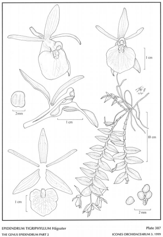 "Epidendrum tigriphyllum GROUP Megalospathum SUBGROUP Tigriphyllum characterized by the caespitose but branching habit, many leafed stem, fleshy, oblique leaves a short few flowered racemose inflorescence subtended by a large semi-ovate spathe carrying a few resupinate flowers with the coulumn obliquely united to the lip, occasionally free. The species is closely related to Epidendrum stanhopeanum which has smaller, greenish flowers dotted with purple, the lip semicircular, deeply cordate, the margins finely dentate. Epidendrum miradoranum Dodson & Bennett is most similar but can be distinguished by the two small simple callus, orbicular, deeply cordate lip, the wider petals 2 vs .8" [5 vs 2 mm], the nectary not being narrowed at the middle of the column. Epidendrum escobarianum Garay has a cordate, narrowly acuminate lip deep red in color and a small nectary which does not form a vesicle behind the sepals. Epidendrum obliquifolium Ames, F. T. Hubb. & c. Schweinf. and Epidendrum plagiophyllum Hágsater have much smaller flowers. All plants except E. miradoranum and E. plagiophyllum have the leaves marked with transverse maroon bands." Hagsater etal 1999