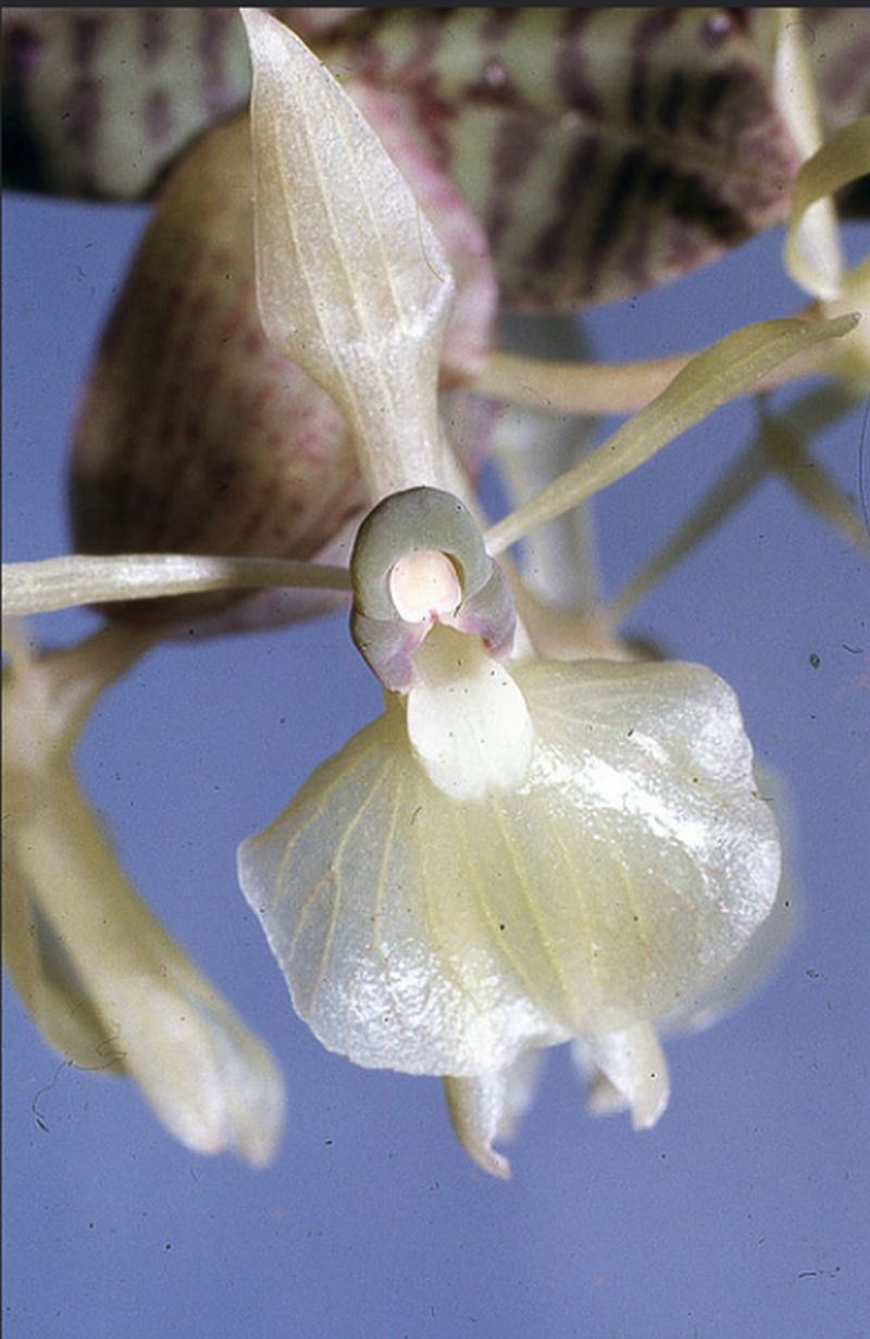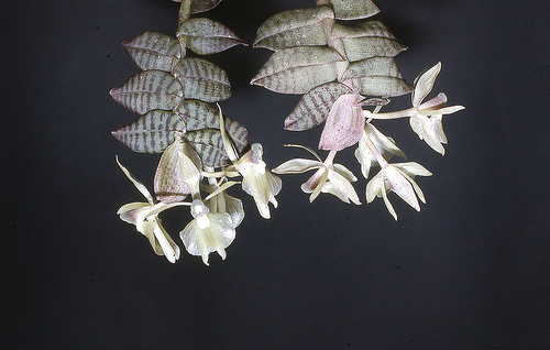 Found in Antioquia department of Colombia at elevations around 2500 meters as a small sized, cold growing epiphyte with canelike, terete stems carrying numerous, all along the stem, all in the same plane, ovate-lanceolate, greyish green with irregular transverse maroon barred leaves that blooms in the winter [in cultivation] and spring on a terminal, from the mature stem, sessile, peduncle to .6" [1.5 cm] long, simultaenosuly 3 to 4 flowered inflorescence with very small floral bracts and carrying resupiante, grayish-green flowers with a somewhat tinged pink lip and a reddish tinged column and an apple green clinandrium.