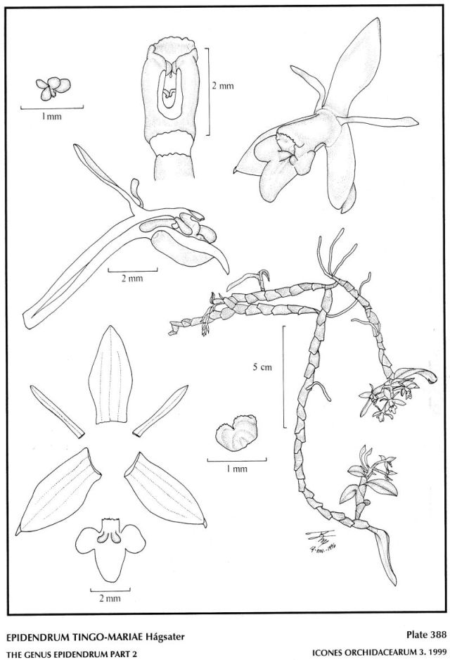 "Epidendrum tingo-mariae belongs to the GROUP Nanum , and can be recognized by its 3-lobed lip, the slightly arched column with a prominent, erose clinandrium, the green f1owers, with the anther also green, and the short nectary that does not penetrate further than the perianth. Epidendrum millenae recorded from both Bolivia and Ecuador, also to be expected in Peru, has green flowers with a prominent purple anther, straight column with a short, entire clinandrium. Epidendrum nanosimplex Hágsater has a simple, entire lip, the vescicle of the ovary occupying about 1/3 of the ovary, and the entire clinandrium which slightly covers the anther. Epidendrum madsenii Hágsater & Dodson has a 3-lobed lip, a triangular, acute midlobe, a prominent dentate clinandrium, and the ornamentation of the anther consisting of a transverse, dentate process in front. Epidendrum macasense Hágsater & Dodson has shorter, narrower leaves, narrower petals, an unornamented anther, and an ovary which is not inflated and swollen into a vescicle at the base. In Epidendrum bonitense Hágsater & Dodson, the nectary does not reach the base of the ovary, the clinandrium is barely erose and the sepals are 4 to 5 veined, the midlobe of the lip is short-subquadrate and obtuse. Epidendrum nanum has larger f1owers, the sepals being .32 to .44" [8 to 11 mm] long, a long dentate clinandrium, and the midlobe of the lip triangular, acuminate. Epidendrum lueri Dodson & Hágsater, is similar but has a differently dentate clinandrium, shorter midlobe of the lip and a prominent front ornamentation of the anther." Hagsater etal 1999