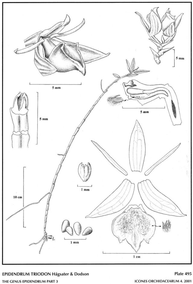 "Epidendrum triodon belongs to the GROUP Elleanthoides SUBGROUP Guacamayense and is recognized by the branching stems, short, fleshy lanceolate leaves, paniculate inflorescence with successive distichous, olive-green flowers, the linear-lanceolate, acuminate petals and the three-dentate lip, puberulose inside and embracing the column without overlapping, with the three-pointed margins turned outwards. Epidendrum guacamayense Hágsater & Dodson has thin, longer, grassy leaves, WITH the lip ovate-reniform, rounded except for the apiculate apex, with the lateral lobes overlapping above the column.