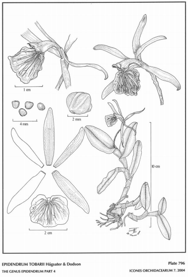 "Epidendrum tobarii belongs to the GROUP Difforme which is recognized by the caespitose, sympodial plants, fleshy, pale green to glaucous leaves, apical inflorescence, sessile, rarely with a short peduncle, one-flowered to corymbose, without spathaceous bracts, fleshy, green to yellowish green, rarely white flowers. The new species has short plants, about 4.8" [12 cm] tall, small leaves, single flowers, sepals and petals narrowly elliptic, the sepals 9 to 11 veined, the petals adnate to the basal third of the column, 7 veined and the lip subquadrate with numerous thickened veins, the column arching and long with a prominent clinandrium hood. It is similar to Epidendrum platychilum which is found both north and south, has wider and longer leaves 2.4 to 3.24 x .92 to 1.36" [6 to 7.6 x 2.3 to 3.4 cm], sepals and petals with a sinuate, revolute margin, and the obovate, 3 to 5 veined petals adnate only to the base of the column. Epidendrum kerryae Hágsater & L. Sánchez has larger plants, wider, longer leaves 2 to 3.8" x 1 to 1.6" [5 to 9.5 x 2.5 to 4 cm], a triquetrous ovary, with a swollen vesicle behind tlíe perianth, the lip suborbicular with the veins on the disc only slightly thickened, and a short, straight column .32to .36" [8 to 9 mm] long. Other species of this group with swollen veins are Epidendrum amparoanum Schltr. from the Pacific slope of Costa Rica and Panama, and Epidendrum yojoaense Hagsater from the Atlantic slope in Honduras." Hagsater etal 2004