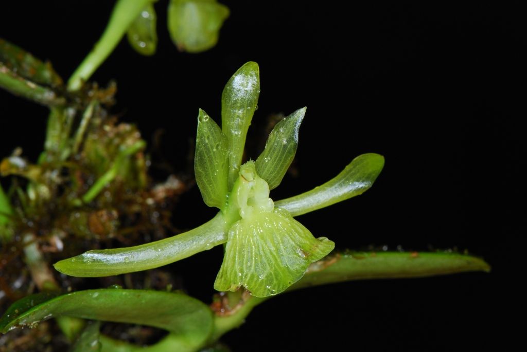 Found in Pichincha province of Ecuador at elevations around 800 to 850 meters as a mini-miniature sized, warm growing epiphyte with simple, cane-like, somewhat laterally compressed, straight stems carrying 3 to 4, equidistant all along the stem, sub-coriaceous, ovate-elliptic, bilobed apically, entire margin leaves that blooms in the spring and summer on a terminal, without a spathe, occuring only once, subcorymbose, sessile, single flowered inflorescence with much shorter than the ovary, ovate, rounded floral bract carrying a resupinate, yellowish green flower apparently without fragrance.