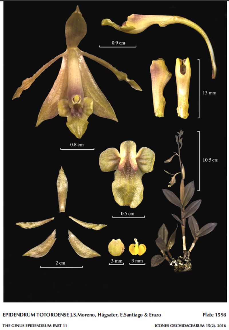 "Epidendrum totoroense belongs to the GROUP Excisum SUBGROUP Friderici-guilielmi , recognized by the sympodial habit, tall, unbranched stems, 3 to 5, unequal leaves, the sub-erect inflorescence with a prominent spathe. The species is recognized by the short stems to 3" [7.5 cm] tall carrying 2 to 4 elliptic leaves 1 to 2" x .52 to .8" [2.5 to 5.0 x 1.3 to 2.0 cm], erect inflorescence 5.4" [13.5 cm] long, flowers yellowish brown with the apex of the column and disc tinged purple, sepals .74" [19 mm] long, and the lateral lobes of the lip smaller than the mid-lobe. Epidendrum philippii is vegetatively very similar, but the inflorescence is short, 1.6" [4 cm] long, sepals .4" [10 mm] long, and the lateral lobes of the lip are somewhat larger than the mid-lobe which is emarginate. Florally, the new species is very similar to Epidendrum sisgaënse Hágsater, but this species has stems to 34,8" [87 cm] tall, larger, oblong-elliptic leaves 2.6 to 7.4" x .52 to 1.6" [6.5 to 18.5 x 1.3 to 4.0 cm], flowers are greenish brown, the lip red, and the lateral lobes of the lip about the same size as the mid-lobe, which has a slightly sinuate apex. Epidendrum carlos-uribei Hágsater & E.Santiago has taller stems 6.8 to 11.2" [17 to 28 cm] tall, 3 to 5 elliptic-lanceolate leaves 3 to 3.72" x .6 to .52" [7.5 to 9.3 x 1.5 to 2.3 cm], and arching nutant inflorescence 4.4 to 7.2" [11 to 18 cm] long with up to 10 flowers which are brownish-orange, the lip yellow." Hagsater etal 2016