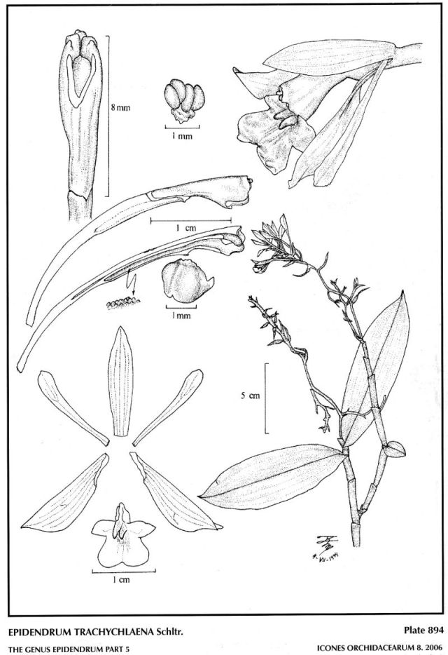 "Epidendrum trachychlaena belongs to the GROUP Andean SUBGROUP Fritzianum Characterized by the monopodial stems branched above, the ovate to ovate-elliptic, acute to short acuminate leaves, the lateral sepals obliquely united to the base of the column, and clearly three lobed lip. the species is characterized by the branching habit, ovate, acute, membranaceous leaves, paniculate nodding inflorescence and can be recognized by the large leaves, successive flowers (though several open at one time) the 3-lobed, bicallose lip, the somewhat acute lateral lóbes much smaller than the midlobe which is widened towards the apex, rounded and emarginate sepals .64 to .68" [16 to 17 mm] long, and the narrowly obcuneate, 1-veined petals. Epidendrum alexii Hagsater & Dodson is closely related, does not seem to have any vegetative difference, but the midlobe of the lip is linear-spatulate (expanded near the apiculate apex, much longer than wide, the sepals are 3.8 to 4.8" [9.5 to 12 mm] long. It is apparently also closely related to E. scabrum Ruiz & Pavón, at least with the type which shows acute leaves and is clearly a member of the GROUP Andean SUBGROUP Fritzianum. Epidendrum lima Lindl. has been confused with this species, but it has smaller more numerous leaves, a main stem with branching above, and a racemose inflorescence with the lip narrower at the isthmus." Hagsater 2006