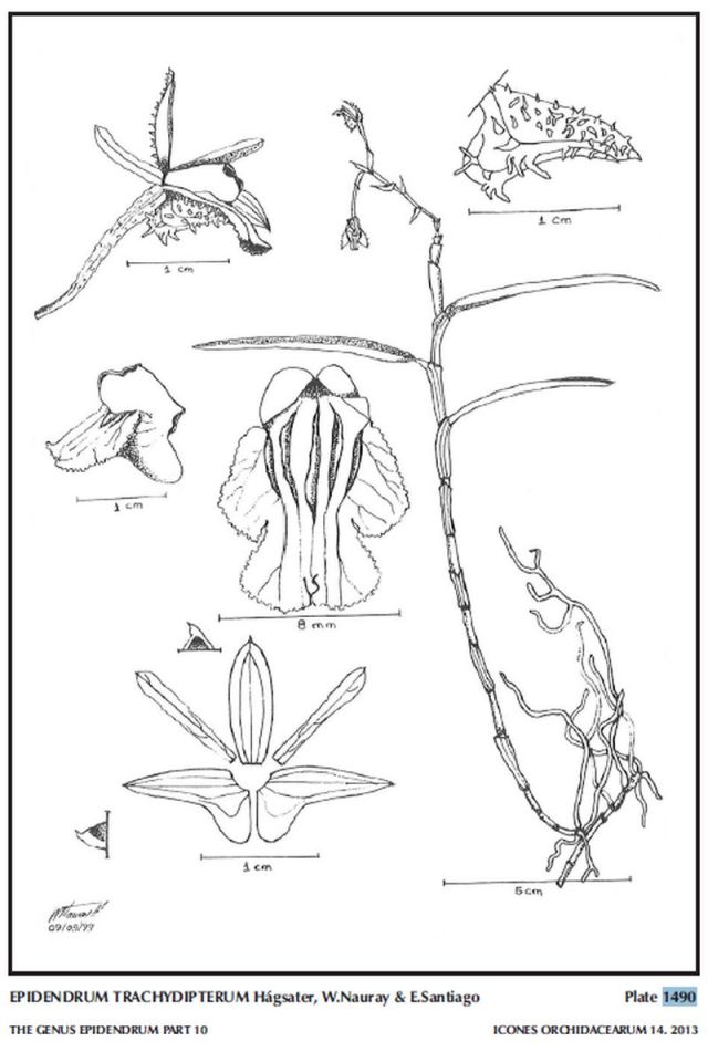"Epidendrum trachydipterum belongs to the GROUP Diothonea SUBGROUP Diothonea which is characterized by the branching plants, linear lanceolate to oblong, bilobed leaves, racemose, arching-nutant inflorescence, membranaceous, rarely fleshy flowers, the entire to 3-lobed, ecallose lip with the margin erose without or with 1 to 10 thin, smooth to erose ribs, the column completely to obliquely united to the lip, the anther reniform. The species is recognized by the greenish brown flowers, the sepals ca. .4 to .44" [10 to 11 mm] long dorsally ornate with spine-like appendages, lip united to the column, deeply 3-lobed, the mid-lobe forming two lobes separated by a deep, narrow sinus, the disc with 5 parallel, laminar ribs, the apex of the column with a pair of prominent rounded wings. Epidendrum trachysepalum Hágsater is vegetatively similar, also with long, narrow leaves, but the lip is totally free from the column, cuneate at the base, disc provided with 5 ribs which disappear towards the apical half of the lip, but are very prominent towards the sac-like base of the lip, where they are hidden under the column; the lateral ribs are united at the base in the shape of a narrowly inverted “U”, plicate and hollow, the central rib is hidden, straight, and smooth. Epidendrum trachypentatropis Hágsater & E.Santiago has shorter leaves and smaller flowers with sepals .22 to .248" [5.5 to 5.7 mm] long, the lip is ornate with 5 prominent, short, unequal, high ribs, hidden beneath the column. Epidendrum astetei Hágsater, Collantes & Mormontoy has yellow greenish flowers with veins and edges lined purple, the sepals dorsally glabrous .4 to .48" [10 to 12 mm] long, the column thick, nearly totally united to the lip and with a column foot that forms a sac-like prominence at the base of the sub-pandurate lip, the margin hyaline, dentate, the disc with 5 laminar keels which become prominent within the sac of the lip, under the column, the lateral ribs are united at the base in the shape of a narrowly inverted “U”, the central rib is hidden, straight, and smooth." Hagsater etal 2013