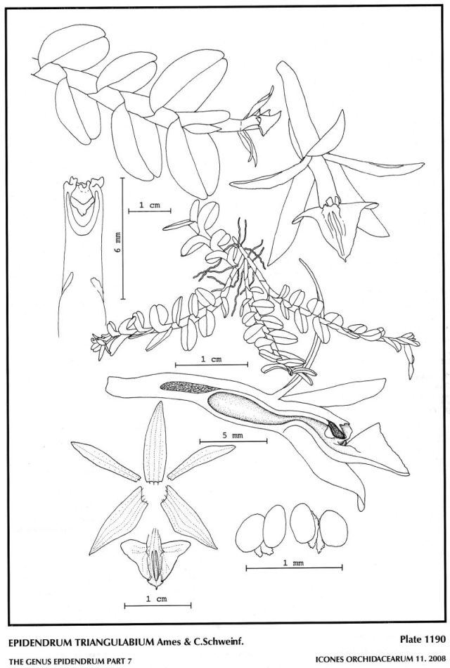 References W3 Tropicos, Kew Monocot list , IPNI ; The Genus Epidendrum Ames 1936; Ceiba Vol 5 No 1 L O Williams 1956; Die Orchideen 3 Auflage Bd 1 Sonderabdruck aus Schlechter Lieferung 9 513 - 576 Brieger, Maatsch and Senghas 1977 as Pleuranthium triangulabium; Field Guide to the Orchids of Costa Rica and Panama Dressler 1993; Manual de las Plantas de Costa Rica Vol 3 Hammel, Grayum, Herrera and Zamora 2003; Icones Orchidacearum 11 Plate 1190 Hágsater & Santiago 2008 drawing fide; Icones Orchidacearum 12 Plate 1296 Hagsater 2009 see recognition section; Icones Orchidacearum 12 Plate 1297 Hagsater 2009 see recognition section; Orquideas, Tesoro de Colombia Vol 2 Ortiz & Uribe 2017 photo fide;