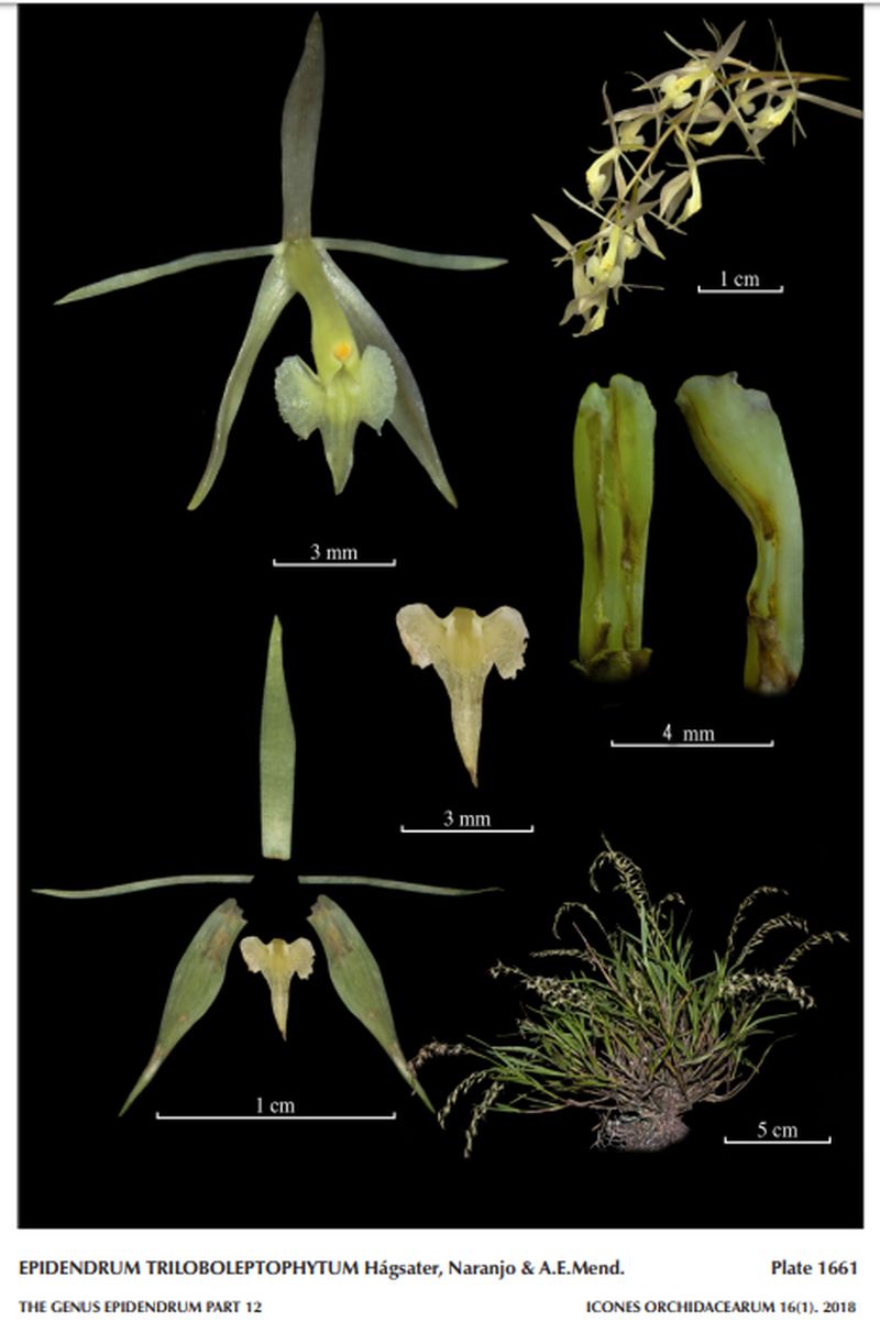 "Epidendrum triloboleptophytum belongs to the GROUP Leptophytum which is characterized by the straggling vegetative habit forming compact plants, delicate, grass-like, linear leaves, inflorescence racemose, subtended by a narrow, conduplicate spathe, flowers pale yellow, delicate, lip entire or 3-lobed, bicallose, calli elongate, parallel, fleshy, blending into a low midrib which runs down the middle of the lip. The species is recognized by the deeply 3-lobed lip, lateral lobes dolabriform, mid-lob narrowly triangular, acuminate. Epidendrum leptophytum Hágsater, has the lip triangular-rhomboid in outline; bicallose, calli elongate, parallel, fleshy, blending into a low mid-rib which runs down the middle of the lip; lip overall triangular with the lateral margins denticulate towards the base, entire towards the apex, basal corners rounded, the base abruptly narrowed, cuneate, fleshy, provided with a pair of basal, very small, retrorse appendages, nearly parallel to the column." Hagsater etal 2018