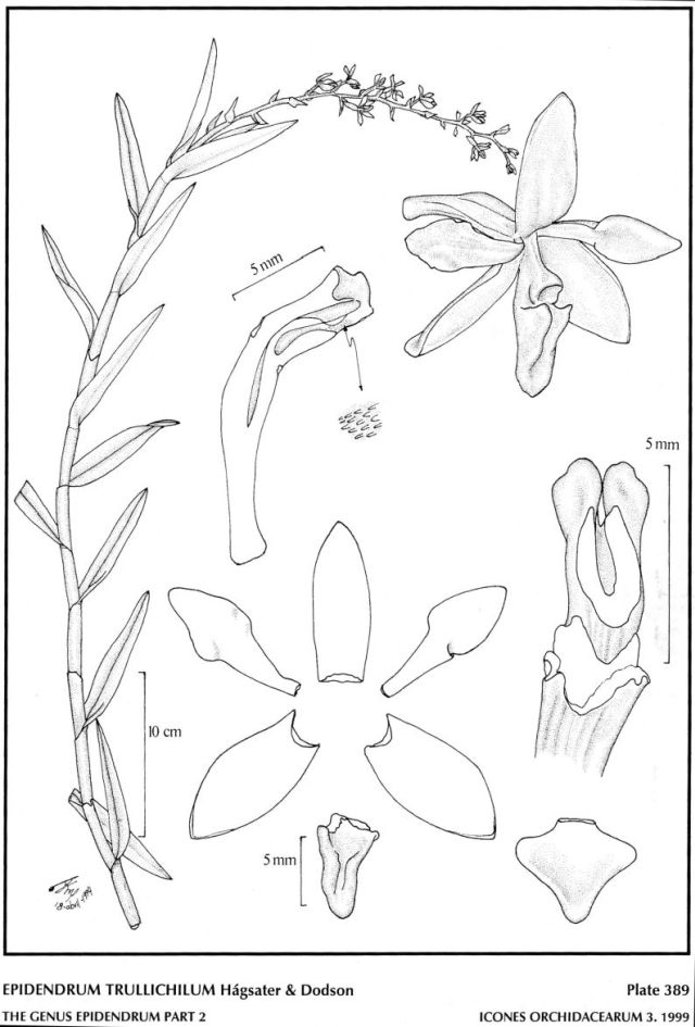 "Epidendrum trullichilum belongs to the GROUP Macrostachyum SUBGROUP Macrostachyum and is recognized by its erect leaves, subparallel to the stem, widely trullate lip, obtrullate, acute-rounded petals and fleshy clinandrium. It is closely related to Epidendrum orthophyllum which has however, wider leaves, larger floral bracts, the lip triangular, somewhat cordiform, acute, with a short, obsolete clinandrium. Epidendrum oxycalyx Hágsater & Dodson has acuminate floral segments. Epidendrum palaciosii Hágsater & Dodson has numerous simultaneous flowers, the sepals muriculate outside. Epidendrum chondrochilum has a widely cordiform lip and ligulate petals."Hagsater 1999