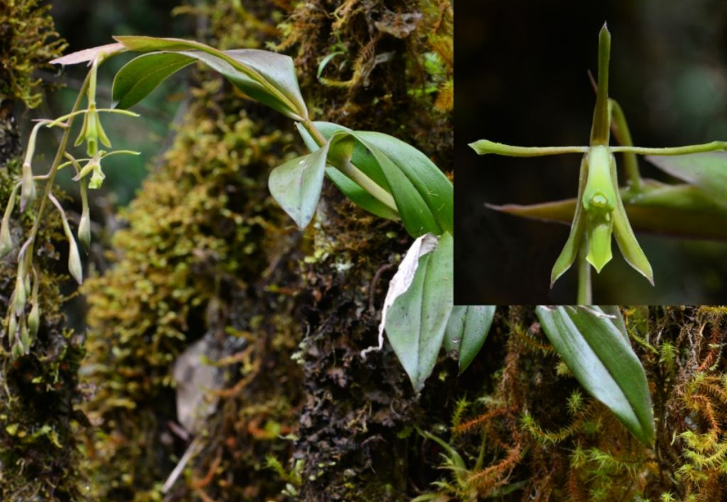 Found in Venezuela, Colombia and Ecuador along the Cordillera Oriental de Colombia to central Ecuador, often on road embankments, and on the eastern slopes of the Andes in Ecuador, above Papallacta, on lava flows at elevations around 1500 to 3100 meters as a small sized, cool to cold growing, ascending epiphyte, lithophyte or terrestrial with a tough, repent rhizome giving rise to erect, canelike, leafy in the apical 1/3, close set, terete at the base, becoming laterally compressed above, produced near the base of the previous stem enveloped by tubular, sheaths and carrying 3 to 5, distributed along the apical 1/3 of the stem, thin, mid nerve finely and sharply sulcate, carinate, unequal, progressively larger, elliptic-lanceolate to linear-elliptic, dorsally carinate, margin entire leaves that blooms in the spring, summer and fall on a terminal, arising through a single, narrow, acute, conduplicate, open on one side towards the apex, covering the whole of the peduncle spathe, arcuate, peduncle terete, 17.7-31.8 cm long, apical, peduncle 3.08 to 5.2" [7.7 to 13 cm] long; rachis 4 to 7.52" [10 to 18.8 cm] long, racemose to paniculate, arcuate, flowering only once, lax, successively 1 to 2, 12 to 20 flowered inflorescence with elongate, narrow, fairly prominent, shorter than the ovary, linear-lanceolate, acuminate, embracing floral bracts and carrying resupinate, green with some pink flushing to yellowish green flowers with a green lip, the calli white and the fragrance was not registered