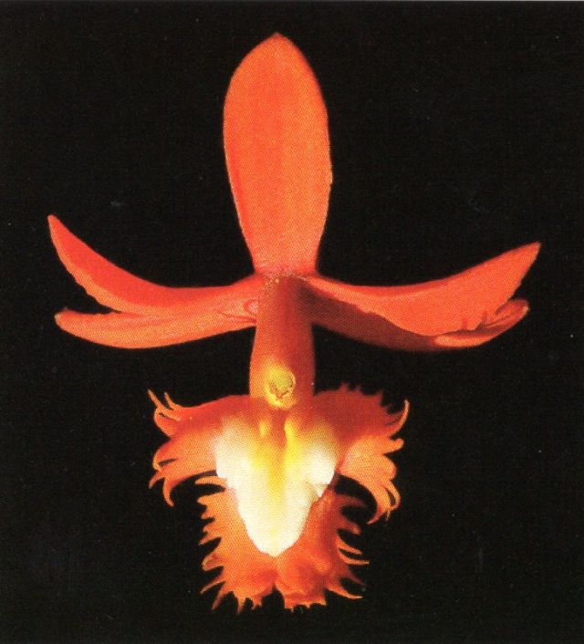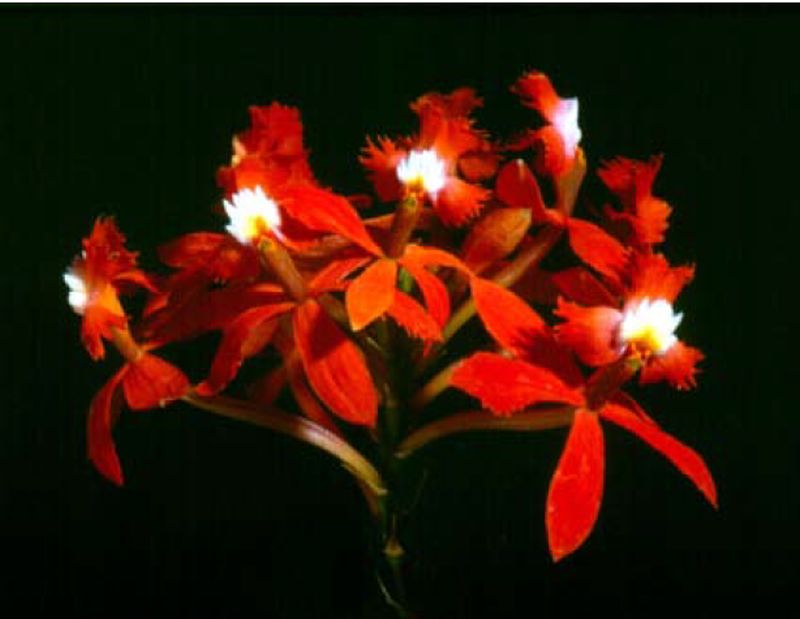 "Similar red-flowered species to Epidendrum aromoense are: Epidendrum tulcanense Hágsater & Dodson has also red flowers but it is distinguished by the large white massive callus, formed by nine unequal tubercles: four basal ones and the main structure formed by five sub-equal tubercles. Epidendrum laurelense Hágsater & Dodson, that differ from E. aromoense by the carmine-red flowers on a much more open raceme, with a massive white callus formed by a semicircular sulcate, marginally plurilobulate fleshy plate, found between Tulcán and Maldonado, on the border between Ecuador and Colombia, on roadsides and rocks in wet forest between at around 2000 to 2500 m above sea level. Epidendrum coroicoënse Schltr. is another species similar to E. aromoense by the lacquer-red flowers; however, the former species is known from southern Peru and western Bolivia, along the upper Amazon slope of the Cordillera Oriental of the Andes, and differ from E. aromoense by the narrow leaves about 6–7 times longer than wide, the petals wider than the sepals, elliptic-sub-orbicular, the lip bearing lateral lobes overlapping with the mid-lobe when spread; and callus 5-tuberculate with two basal and three apical tubercles, and without keels. Epidendrum portokalium Hágsater & Dodson is another species with red flowers that resembles E. aromoense, but it is found on the Amazon slopes of the Andes in central Ecuador, and differs from E. aromoense by the callus unequally 7-tuberculed (with four basal tubercles and three apical ones" Epidendrum aromoense (Orchidaceae, Laeliinae), a New Species from the Coastal Dry Forests in Western Ecuador (PDF Download Available). Available from: Epidendrum aromoense Orchidaceae Laeliinae a New Species from the Coastal Dry Forests in Western Ecuador [accessed Nov 01 2017