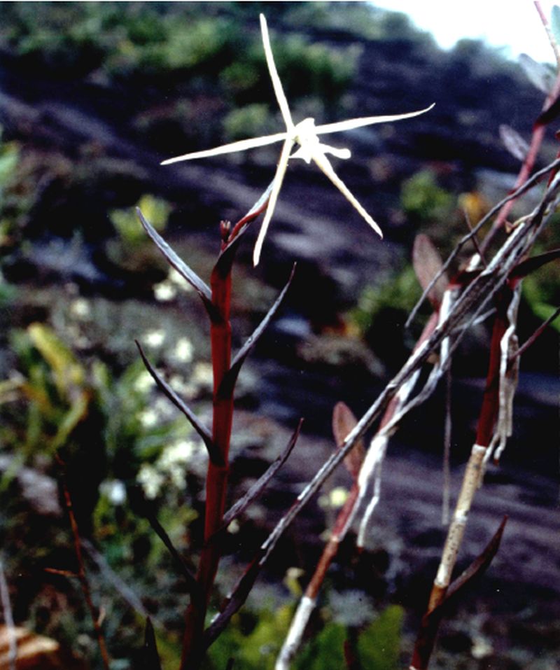 "Epidendrum tumuc-humaciense is part of GROUP Nocturnum Characterized by the simple stems carrying large star-shaped flowers usually with a 3-lobed lip. The species is recognized by the laterally compressed stems, numerous erect leaves distributed throughout the stems, the basal ones generally longer, green to reddish, occasionally deep wine-red, solitary, successive flowers; ovary generally 3.2 to 4" [80 to 100 mm] long, and the body of the capsule occupying the apical half of the fruit, the body sub-globose, with basal peduncle half the length of the fruit, the apical neck short. Epidendrum nocturnum Jacq. is widely distributed throughout the Neotropics at lower altitudes, has terete stems, few leaves, distributed throughout the apical 2/3; the ovary shorter, 2 to 2-8" [50 to 70 mm], body of the capsule occupying most of the length of the fruit and centered, both peduncle and apical neck short. Epidendrum carpophorum Barb.Rodr. is found along the Atlantic lowlands of Venezuela, Guyana down to southeastern Brazil, the stems have few, wide leaves 1 to 2.4" [2.5 to 6 cm] wide distributed along the apical half of the laterally compressed stem, capsule is located slightly beyond the apical middle. Epidendrum erectum Brieger & Bicalho, in the states of Goiás and Mina Garais, Brazil, has densely aggregate leaves along the apical 2/3 of the stems, a shorter ovary, generally 1-6 to 2.4" [45 to 60 mm] long, and the body of the capsule located at the middle of the ovary." Hagsatere etal 2015