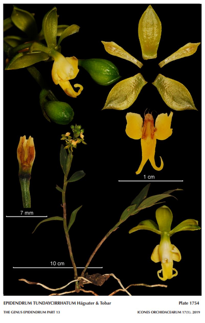 "Epidendrum tundaycirrhatum belongs to the GROUP Bicirrhatum , a small group of species which has appeared recently and is characterized by the caespitose habit, simple, leafy, short stems, a compact, nodding inflorescence, conspicuous bracts about as long as the ovary, numerous fleshy, green and/or white flowers with the mid-lobe deeply bilobate, the lobules sometimes cirrose, the thin pollinia, and unequal, the inner pair smaller, without being of the bird-wing-type. The new species is recognized by the green turning olive-green tepals and lip white turning yellow, sepals .36" [9 mm] long, mid-lobe of the lip cuneate at the base, and bilobed forming two uncinate, cirrose lobes which are involute in natural position. Epidendrum enantilobum Hágsater has green to cream-colored flowers; lip and column white, sepals .16 to .2" [4 to 5 mm] long sepals, lateral lobes falcate-oblong, mid-lobe forming two opposite narrow ciliate lobes. Epidendrum xelidonourum has very pale greenish white to ochre flowers; base of the sepals, petals and column green, column and lip white, lateral lobes of the lip ¼ circle, mid-lobe basal half subrectangular, slightly slimmer at the middle, apical half bilobed, lobes linear triangular, acuminate, arching-divaricate, reminiscent of the tail of barn swallows. Epidendrum brachyblastum has sepals, .24 to .272" [6.0 to 6.8 mm] long, narrow hemi-ovate lateral lobes of the lip, and deep green flowers with lip and apical half of the column snow white. Epidendrum hugomedinae Hágsater has snow-white flowers with keels of the lip tinged violet and the obcuneate mid-lobe formed by two, rounded, somewhat divergent, lobes. Epidendrum bicirrhatum D.E.Benn. & Christenson, from northern Peru, has pale cream-orange flowers with the base of the sepals and petals green, tips of the keels of the lip lavender; flowers are similarly sized, sepals being .184 to .208" [4.6 to 5.2 mm] long, lip has denticulate margins on sub-orbicular lateral lobes and cirrose lobules on mid-lobe. The Bolivian E. ophidion Dodson & Vásquez is quite similar to the latter, but has successive, yellow flowers with three purple lines on disc, pustulate sepals .24 to .32" [6 to 8 mm] long, and dolabriform lateral lobes with a crenulate margin. Epidendrum tiwinzaënse Hágsater & Dodson species has green flowers with a white lip and apical half of column, sepals some .28" [7 mm] long, and a lip terminating in a pair of cirrose lobes" Hagsater etal 2019